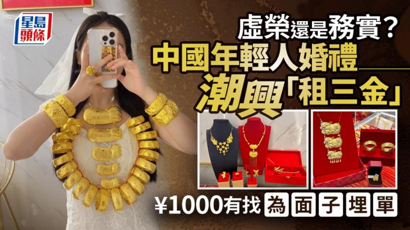 在內地社交平台、購物平台上,一些商家推出「三金」 、「五金」租賃套餐,宣稱「花小錢辦大事」,「百元實現婚嫁黃金自由」等。剛辦完婚禮的成都新娘陳女士受訪坦言,她租了一套總重超過50克的重工黃金首飾,包括龍鳳鐲、項鏈、耳環和戒指,租賃7天花費不到1000元;而若購買這套首飾需花費6萬多元,「婚禮後根本不會戴,壓箱底太浪費了。」