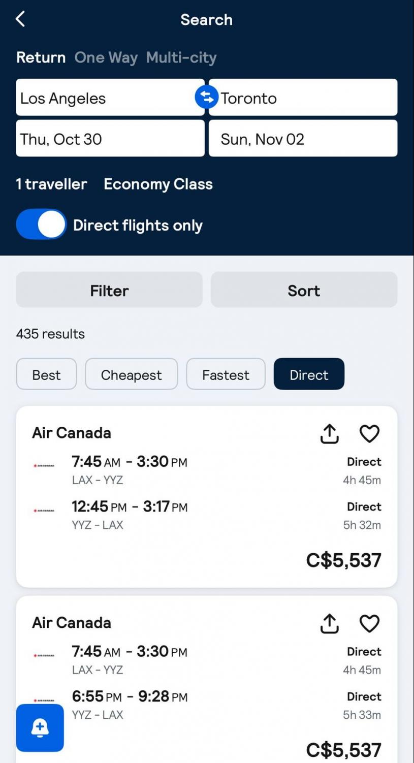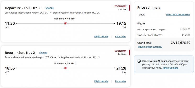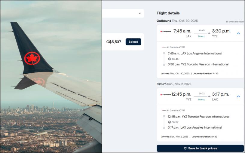 随着比赛热度升温,由美国飞往加拿大观战机票价格亦随之急升。以 10月30日(星期四)出发、11月2日(星期日)返程 为例,加拿大航空(Air Canada)直航来回票价已高达 5,000加币起。