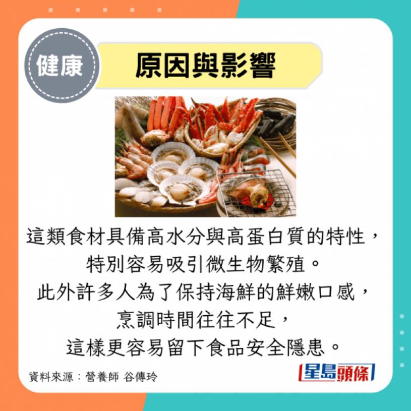 海鮮屬於容易變質的高風險食材,例如魚類、蝦、蟹及貝類。據《International Journal of Food Microbiology》的研究顯示,由於這類食材同時具備高水分與高蛋白質的特性,特別容易吸引微生物繁殖。此外許多人為了保持海鮮的鮮嫩口感,烹調時間往往不足,這樣更容易留下食品安全隱患。