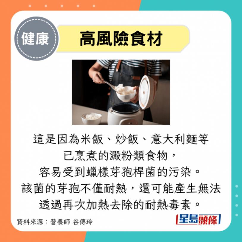 煮好的米飯若未食用完畢,被遺忘在鍋中或未啟動保溫功能的電飯煲裡,超過兩小時,或在32°C以上高溫環境中超過一小時便存在食物安全隱患。這是因為米飯、炒飯、意大利麵等已烹煮的澱粉類食物,容易受到蠟樣芽孢桿菌的污染。該菌的芽孢不僅耐熱,還可能產生無法透過再次加熱去除的耐熱毒素。