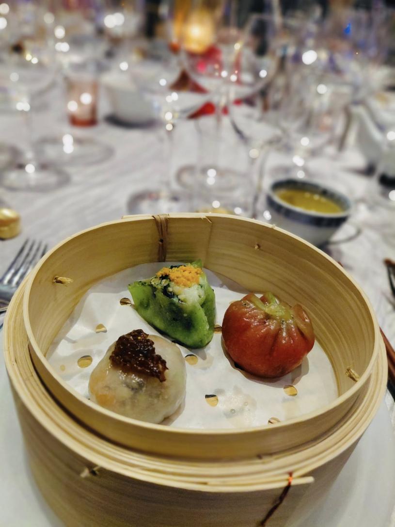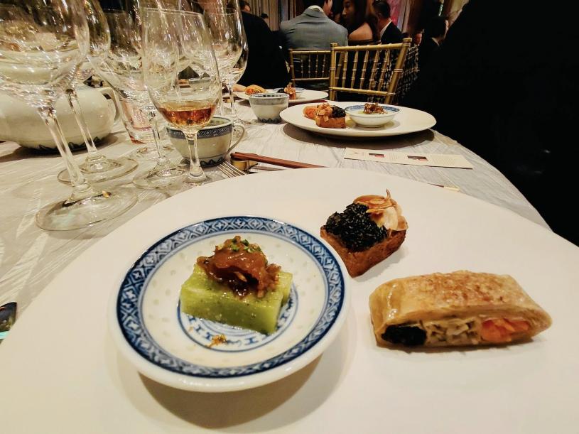 「點心盛宴」以品味酒會揭開序幕,於正式饗宴前首先品嘗由溫哥華主廚創新的點心,包括鄭煜堅的「潮式蟹棗」、賴偉的「宇治抹茶和牛包」、謝承銘的「牛肉燒賣」,以及葉建亨的「脆香牛筋片」。