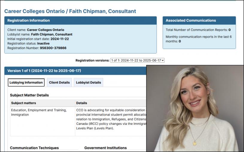 【星岛综合报道】安省技能发展基金丑闻再掀疑云。根据游说者登记纪录,劳工厅长毕锡尼(David Piccini)妻子Faith Chipman注册为职业学院游说团体Career Colleges Ontario工作,而该团体旗下两间学院曾获省府数百万资助。