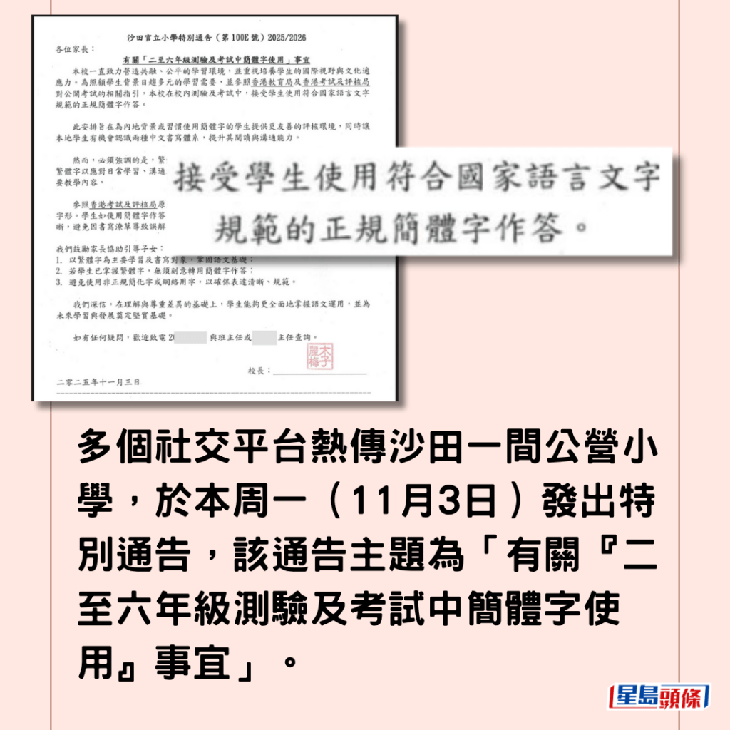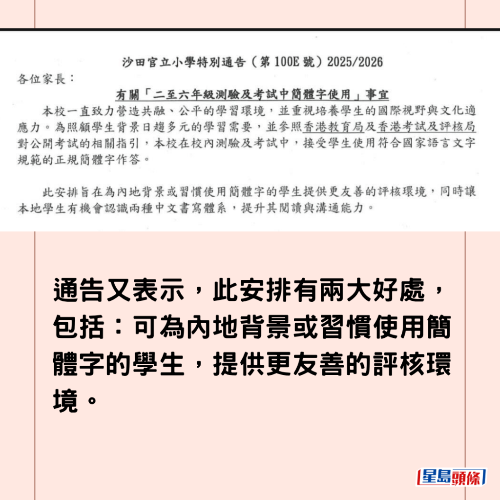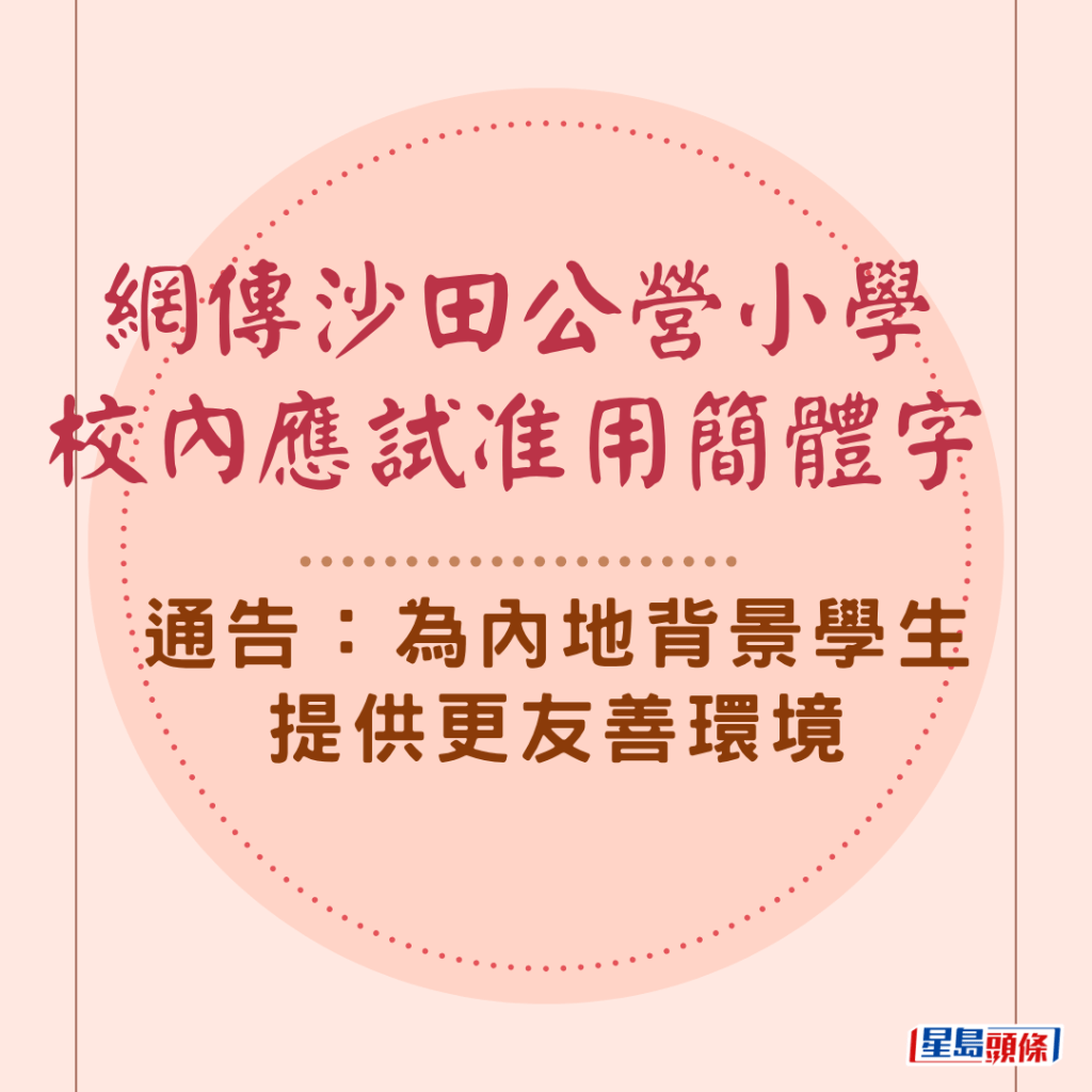 網上熱傳有沙田公營小學發出特別通告,表示批准校內測驗及考試使用簡體字作答,通告解釋此安排旨在為內地背景或習慣使用簡體字的學生,提供更友善的評核環境,同時讓本地學生有機會認識兩種中文書寫體系。