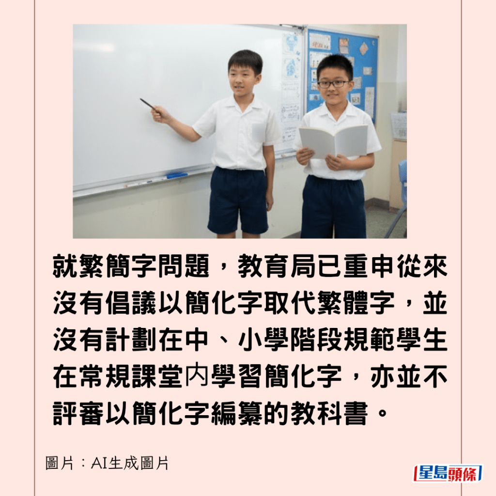 就繁簡字問題,教育局已重申從來沒有倡議以簡化字取代繁體字,並沒有計劃在中、小學階段規範學生在常規課堂内學習簡化字,亦並不評審以簡化字編纂的教科書。