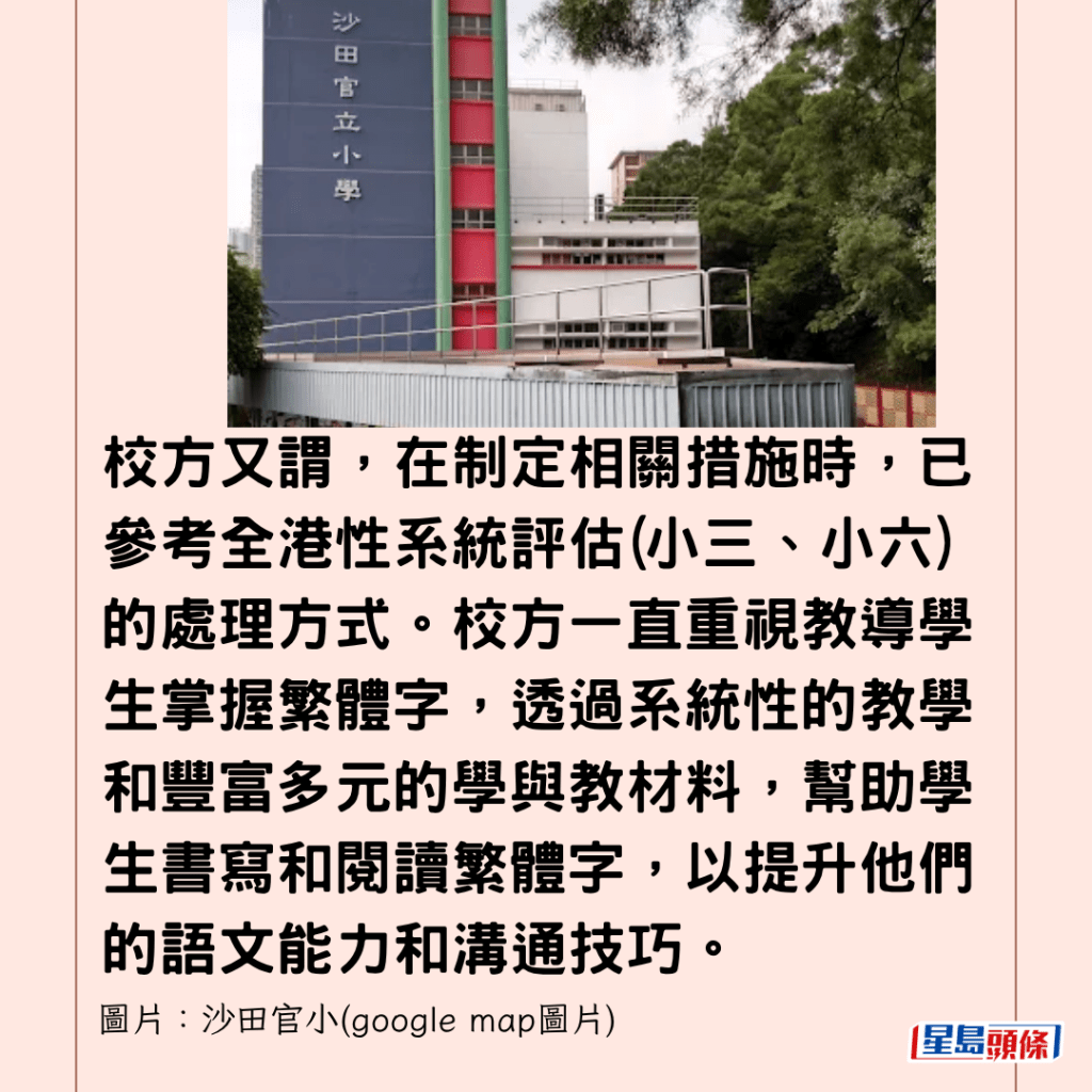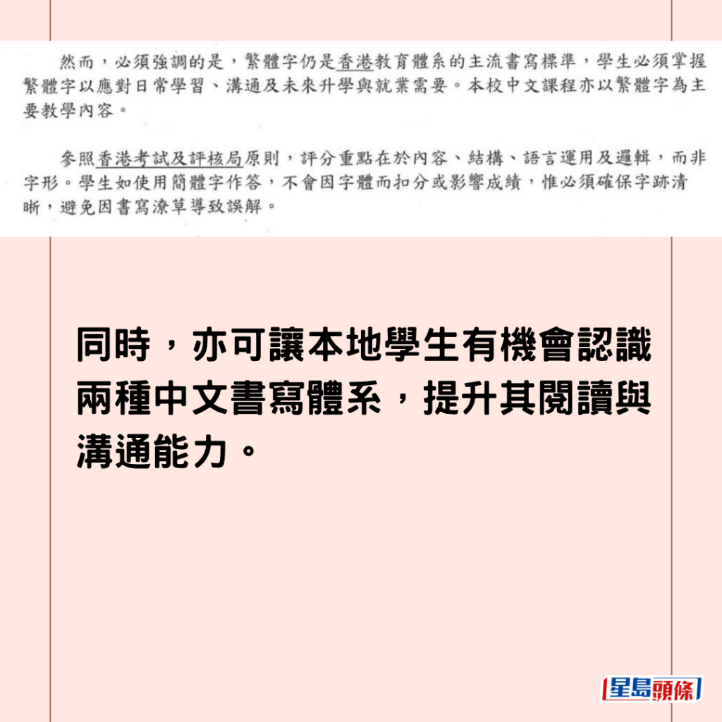 校方又謂,在制定相關措施時,已參考全港性系統評估(小三、小六)的處理方式。校方一直重視教導學生掌握繁體字,透過系統性的教學和豐富多元的學與教材料,幫助學生書寫和閱讀繁體字,以提升他們的語文能力和溝通技巧。
