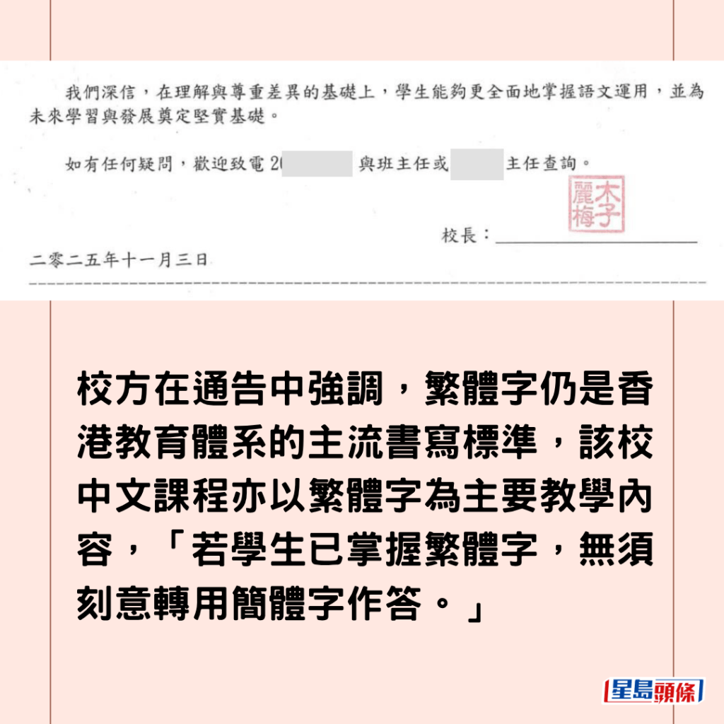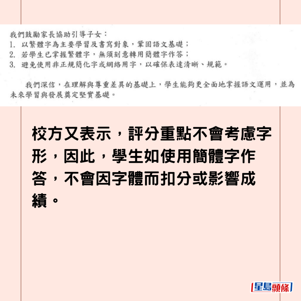 校方在通告中強調,繁體字仍是香港教育體系的主流書寫標準,該校中文課程亦以繁體字為主要教學內容,「若學生已掌握繁體字,無須刻意轉用簡體字作答。」