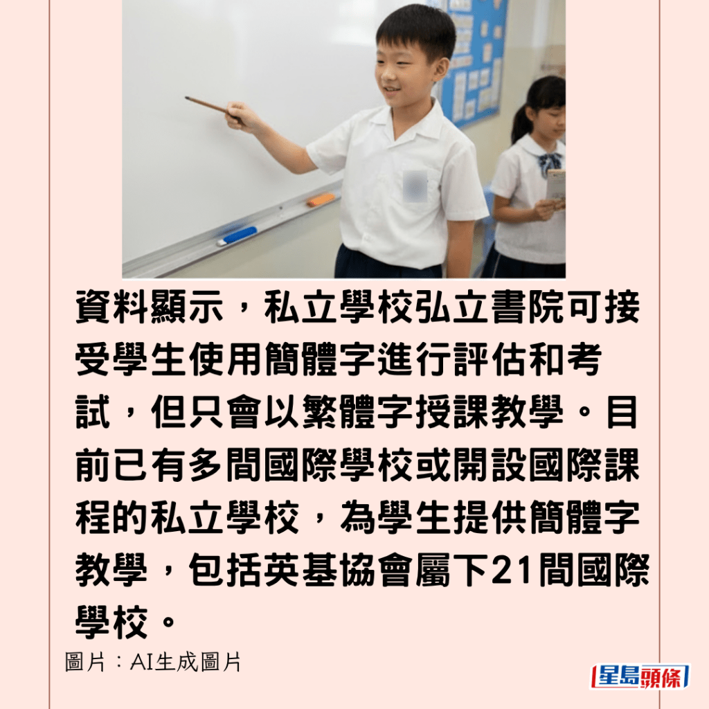 資料顯示,私立學校弘立書院可接受學生使用簡體字進行評估和考試,但只會以繁體字授課教學。目前已有多間國際學校或開設國際課程的私立學校,為學生提供簡體字教學,包括英基協會屬下21間國際學校。