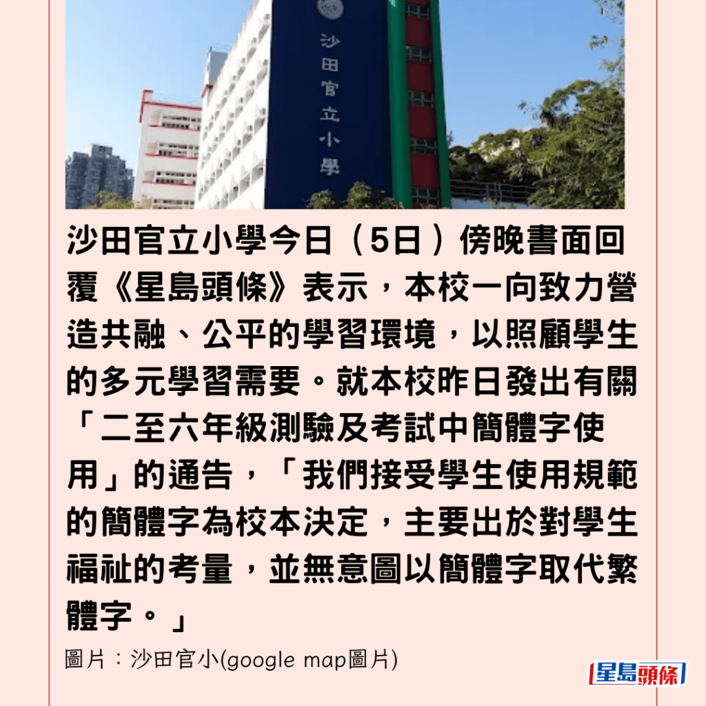 涉事沙田官立小學,今日(5日)傍晚書面回覆《星島頭條》表示,校方一向致力營造共融、公平的學習環境,以照顧學生的多元學習需要。就本校昨日發出有關「二至六年級測驗及考試中簡體字使用」的通告,「我們接受學生使用規範的簡體字為校本決定,主要出於對學生福祉的考量,並無意圖以簡體字取代繁體字。」