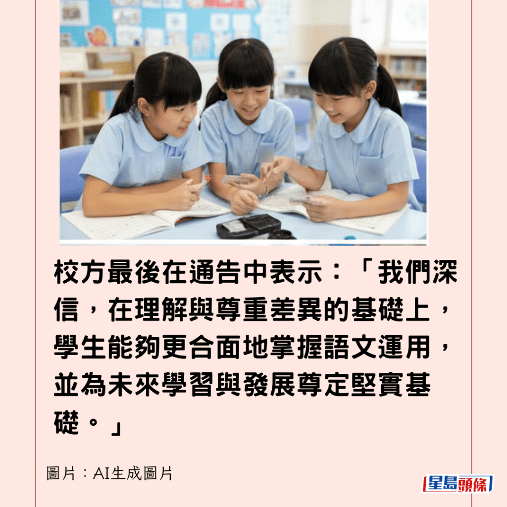 校方最後在通告中表示:「我們深信,在理解與尊重差異的基礎上,學生能夠更合面地掌握語文運用,並為未來學習與發展尊定堅實基礎。」