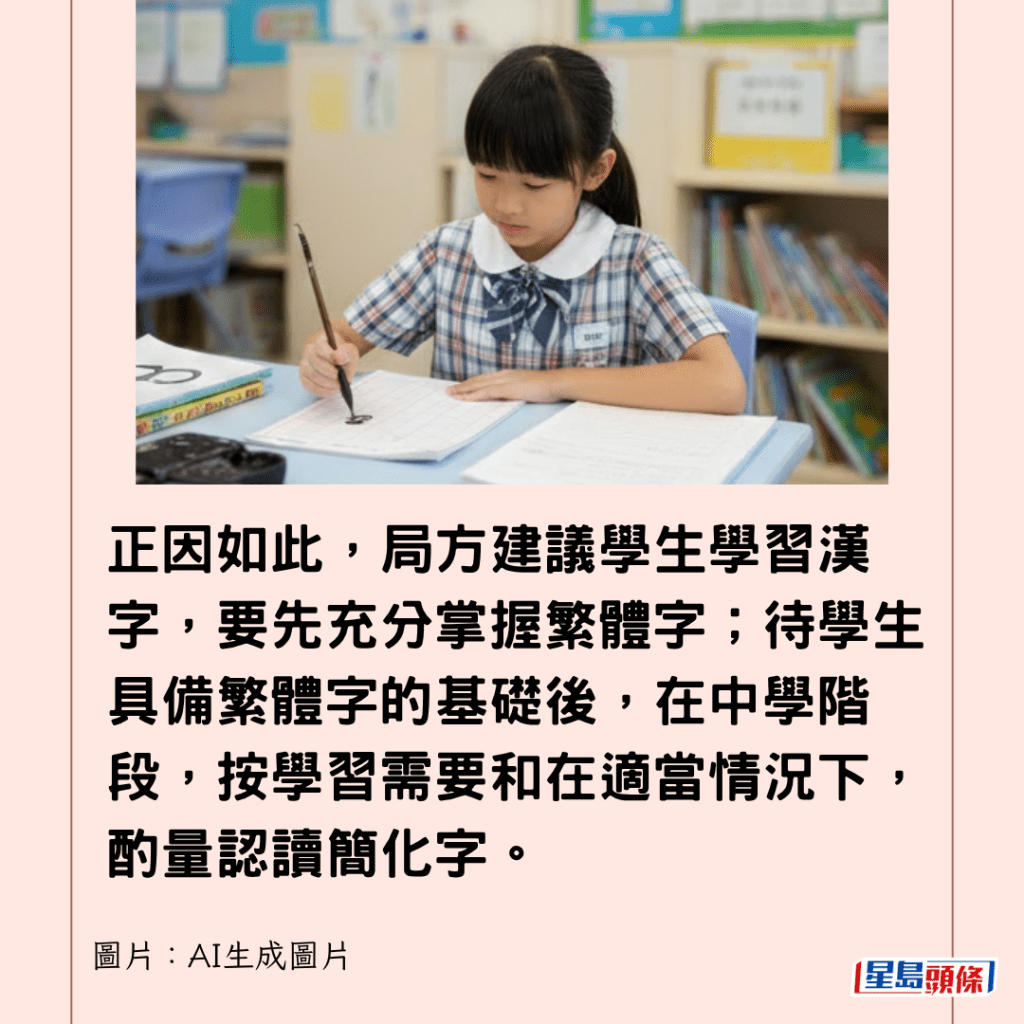 教育局表示,簡化字的認讀,絕不能過早開始,尤其是小學階段,學生如果同時學習繁簡二體,反會造成識字和寫字上的干擾,容易混淆字形,正因如此,局方建議學生學習漢字,要先充分掌握繁體字;待學生具備繁體字的基礎後,在中學階段,按學習需要和在適當情況下,酌量認讀簡化字。