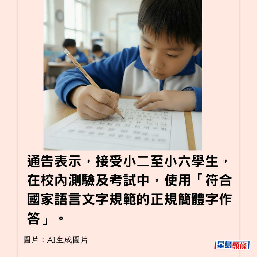 通告表示,接受小二至小六學生,在校內測驗及考試中,使用「符合國家語言文字規範的正規簡體字作答」。