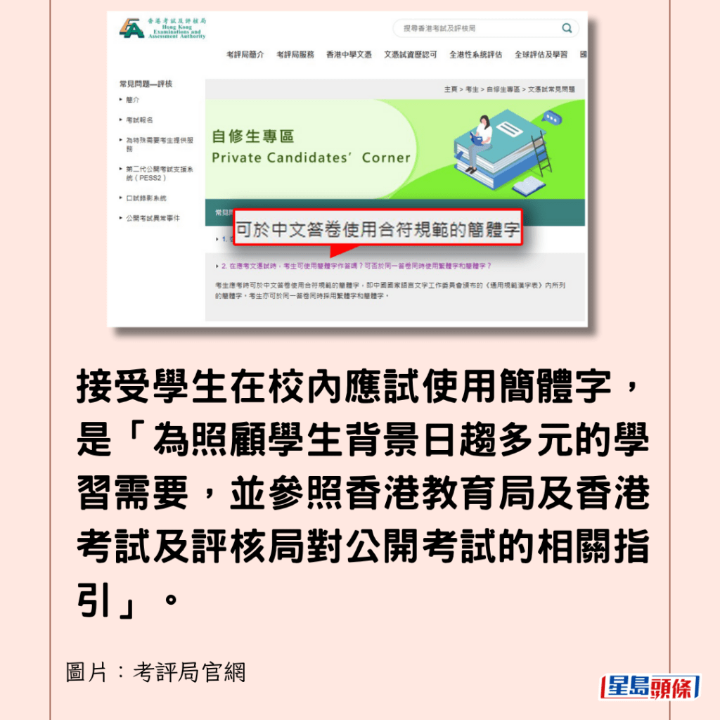 校方又表示,評分重點不會考慮字形,因此,學生如使用簡體字作答,不會因字體而扣分或影響成績。