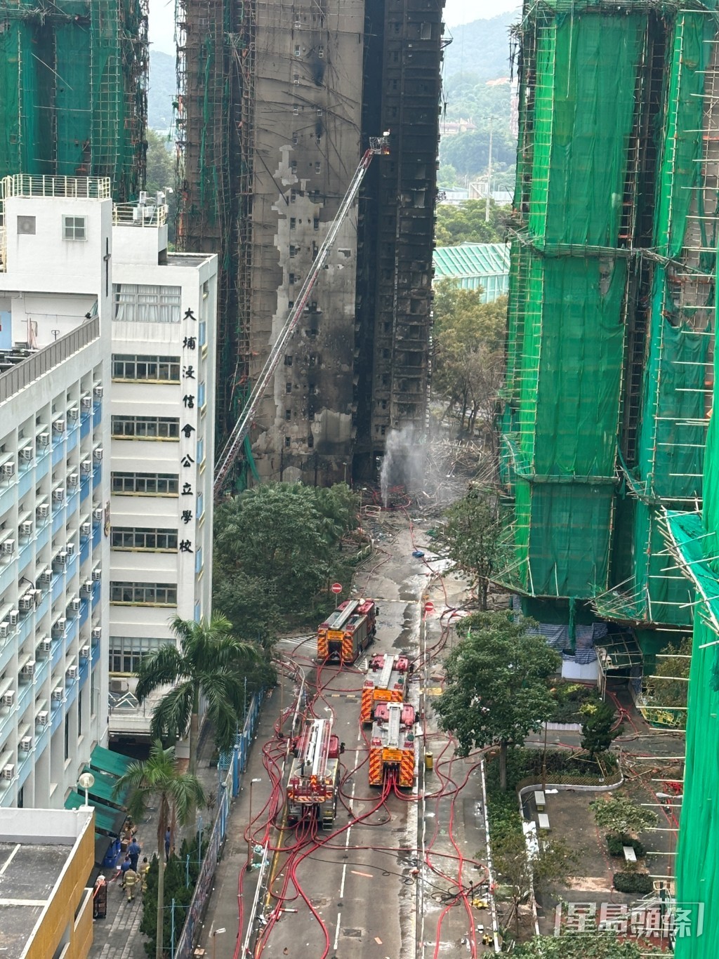 大埔宏福苑五級奪命大火逾百人死亡,今(1日)踏入第六天,警方及消防繼續在宏福苑大火現場調查,災難遇害者辨認組「DVIU」人員到場登樓搜索,而消防亦在場戒備射水。