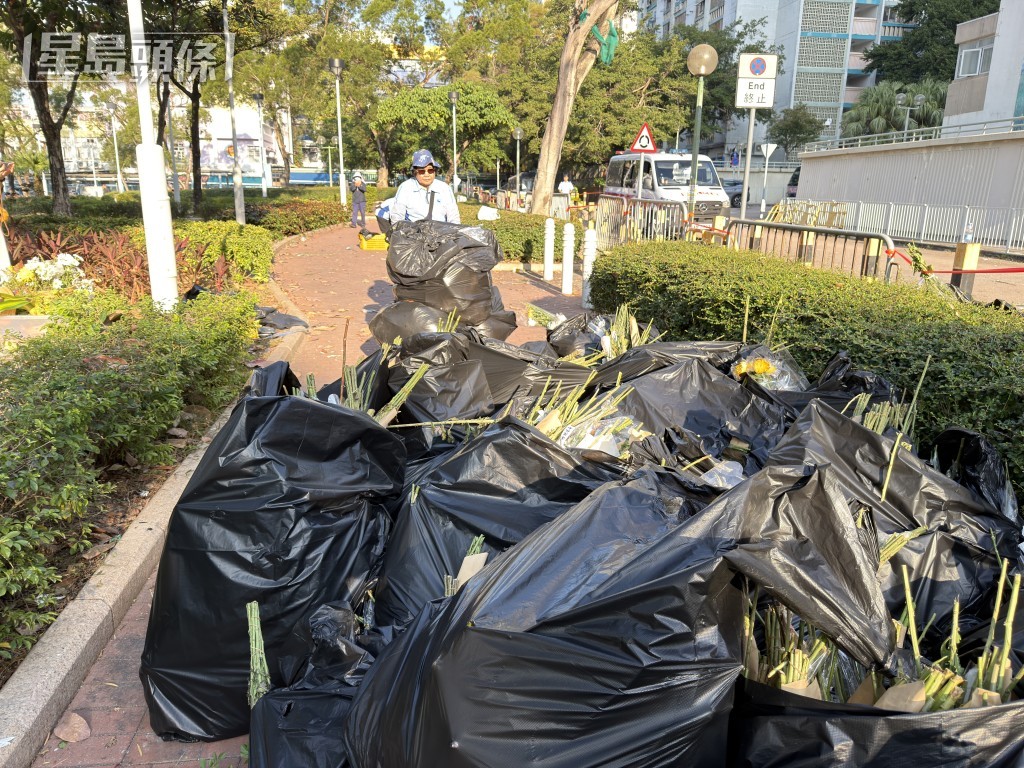 大批棄置的花束被放進多個垃圾袋,由清潔工人清走。梁國峰攝