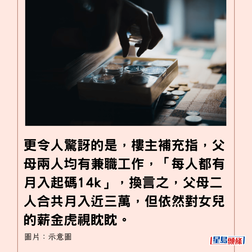 更令人惊讶的是,楼主补充指,父母两人均有兼职工作,“每人都有月入起码14k”,换言之,父母二人合共月入近三万,但依然对女儿的薪金虎视眈眈。她曾尝试提出直接负责家中租、水、电、煤等开支,却被要求连买𩠌、日用品等所有费用一并“负责埋”,令她大感不合理:“你哋人工就唔洗拎出嚟完全系自用就得?边到合理㗎”。