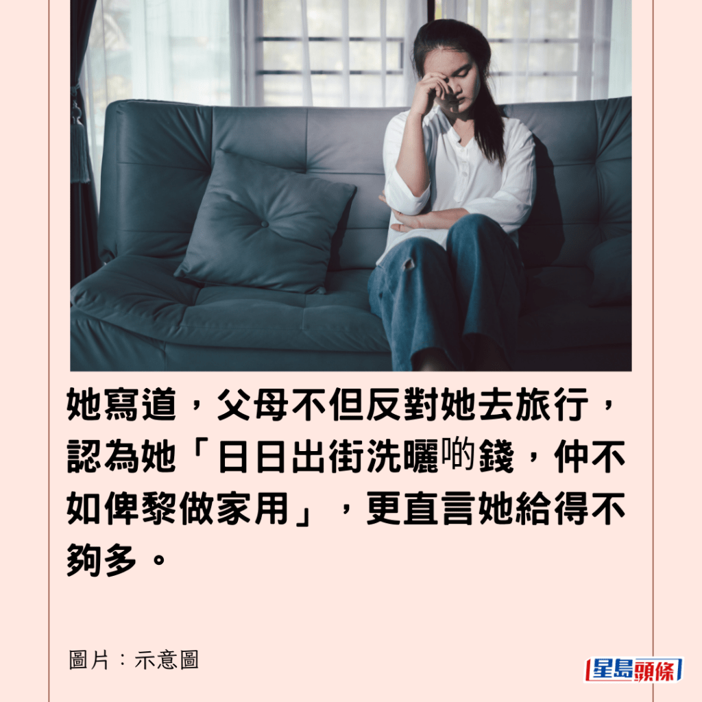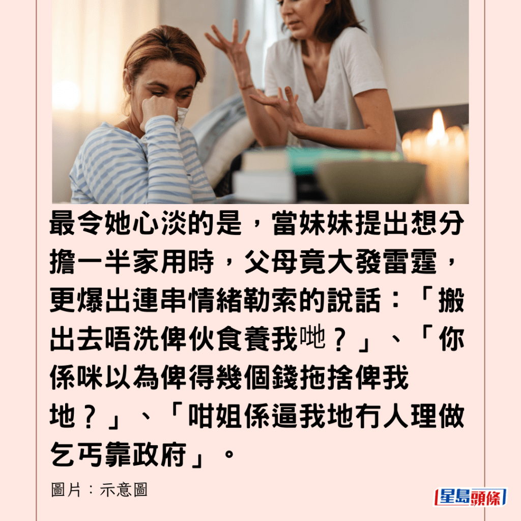 她写道,父母不但反对她去旅行,认为她“日日出街洗晒啲钱,仲不如俾黎做家用”,更直言她给得不够多。最令她心淡的是,当妹妹提出想分担一半家用时,父母竟大发雷霆,更爆出连串情绪勒索的说话:“搬出去唔洗俾伙食养我哋?”、“你系咪以为俾得几个钱拖舍俾我地?”、“咁姐系逼我地冇人理做乞丐靠政府”。