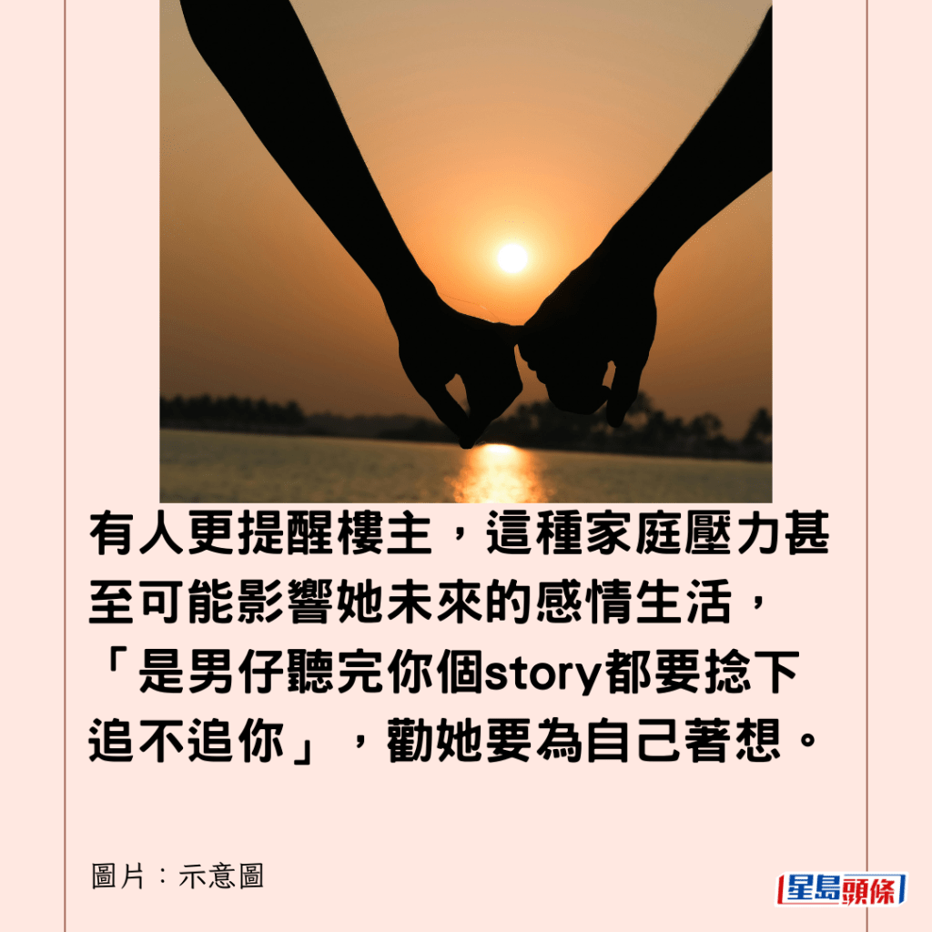 有人更提醒楼主,这种家庭压力甚至可能影响她未来的感情生活,“是男仔听完你个story都要捻下追不追你”,劝她要为自己着想。