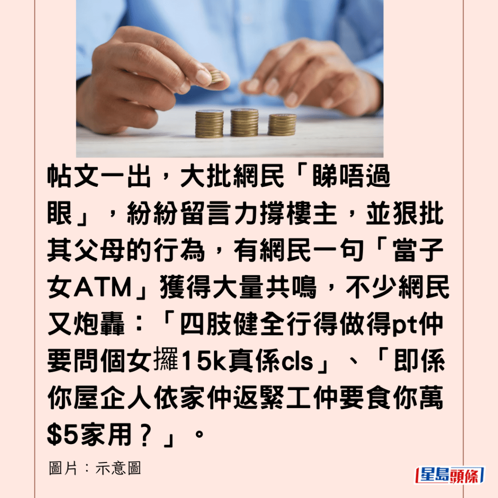 楼主每月付出逾四成收入做家用,她透露父母其实每月均有稳定工作收入,网民得知其父母真实收入后纷纷吓窒,怒轰:“根本当个女系ATM!”帖文引来大量网民共鸣及献计。