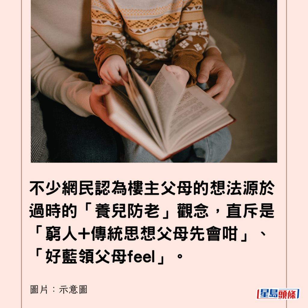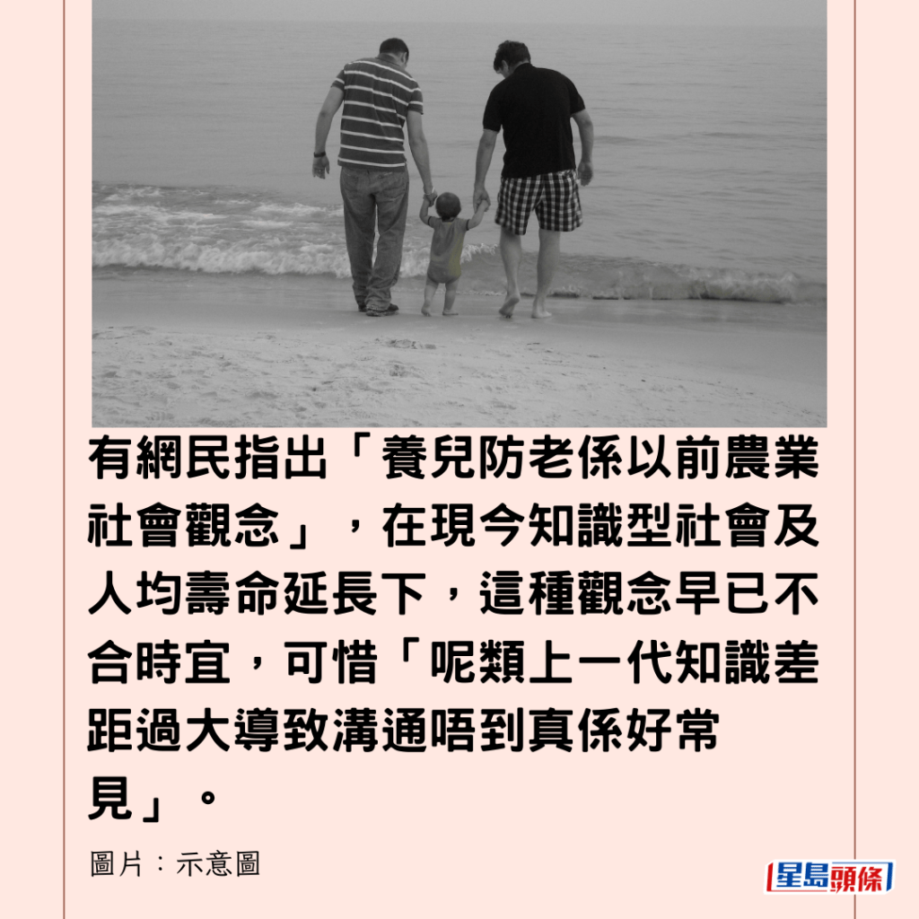 不少网民认为楼主父母的想法源于过时的“养儿防老”观念,直斥是“穷人+传统思想父母先会咁”、“好蓝领父母feel”。有网民指出“养儿防老系以前农业社会观念”,在现今知识型社会及人均寿命延长下,这种观念早已不合时宜,可惜“呢类上一代知识差距过大导致沟通唔到真系好常见”。