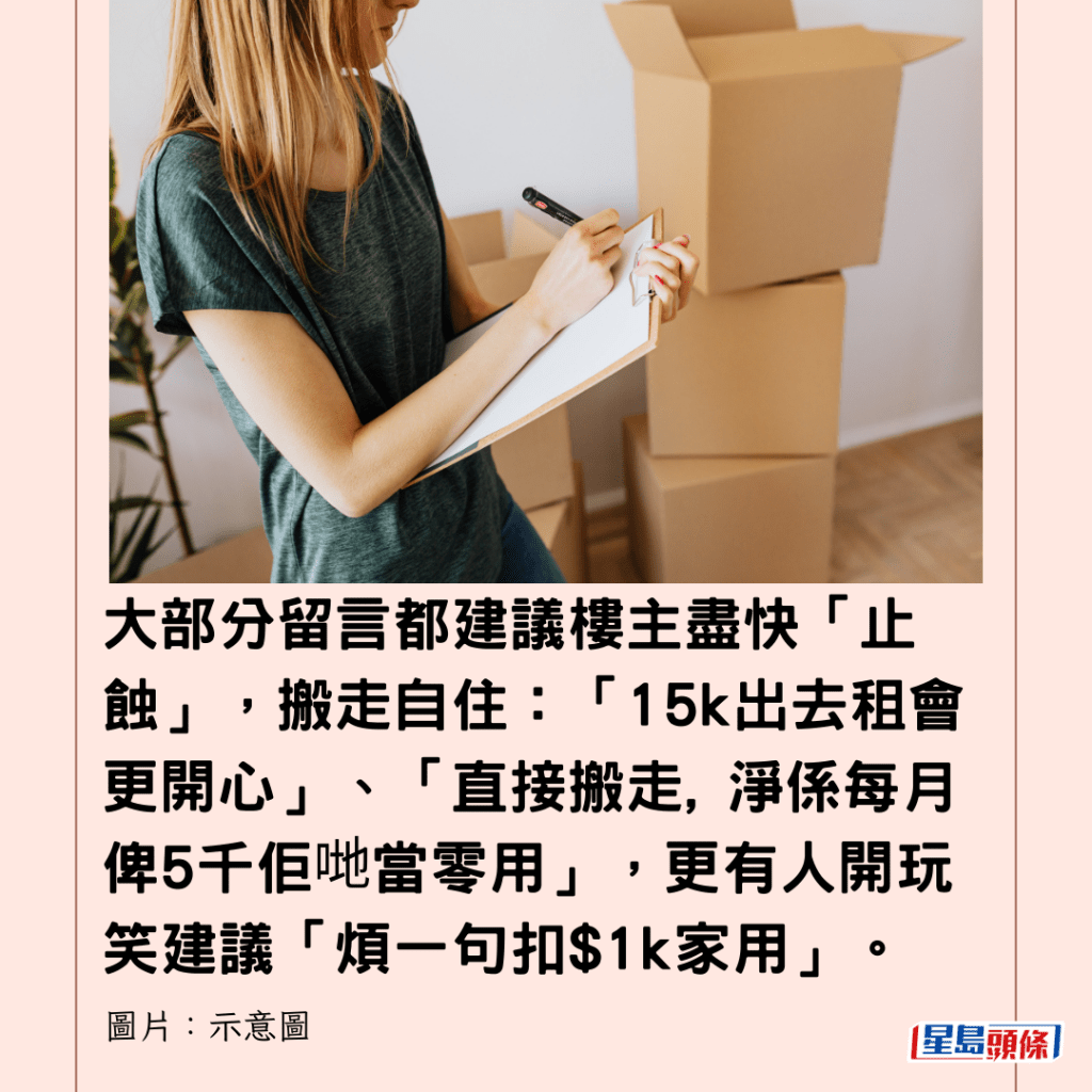大部分留言都建议楼主尽快“止蚀”,搬走自住:“15k出去租会更开心”、“直接搬走, 净系每月俾5千佢哋当零用”,更有人开玩笑建议“烦一句扣$1k家用”。有网民又谓,真正的爱不是枷锁:“真心锡仔女嘅父母唔会要佢哋俾咁多家用,反而会担心佢哋够唔够钱驶...唔好俾佢哋情绪勒索。”