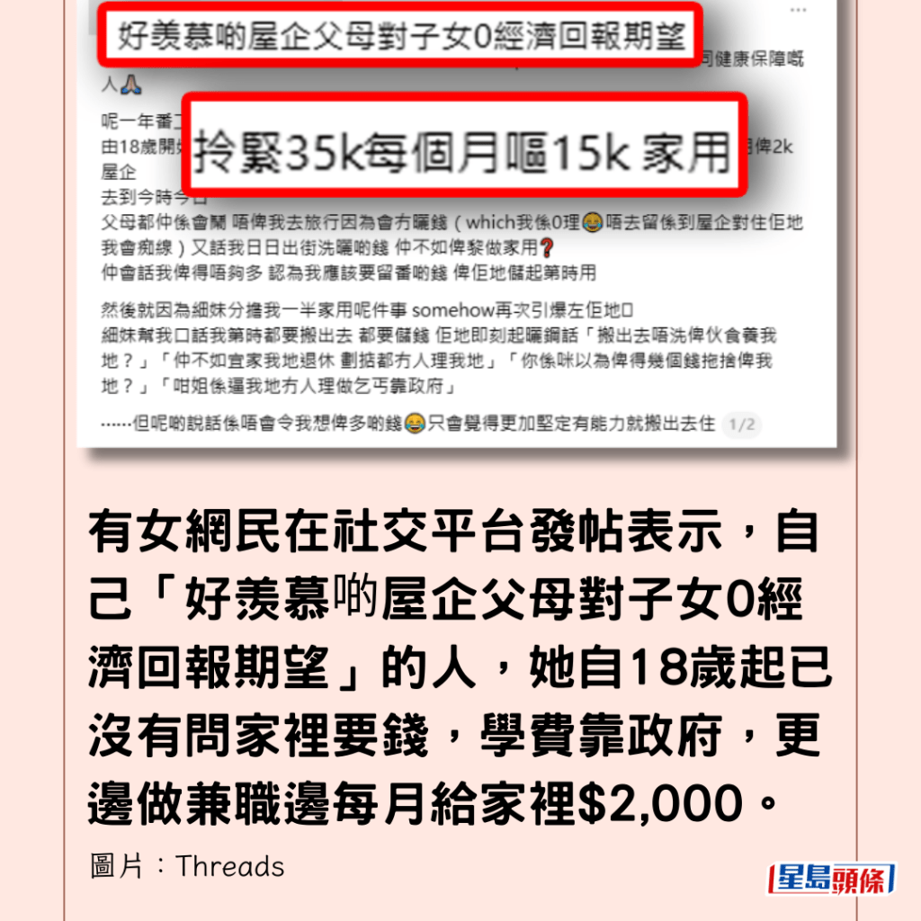 有女网民在社交平台发帖表示,自己“好羡慕啲屋企父母对子女0经济回报期望”的人,她自18岁起已没有问家里要钱,学费靠政府,更边做兼职边每月给家里$2,000。如今投身社会,月薪$35,000,每月家用高达$15,000,但父母仍不满足。