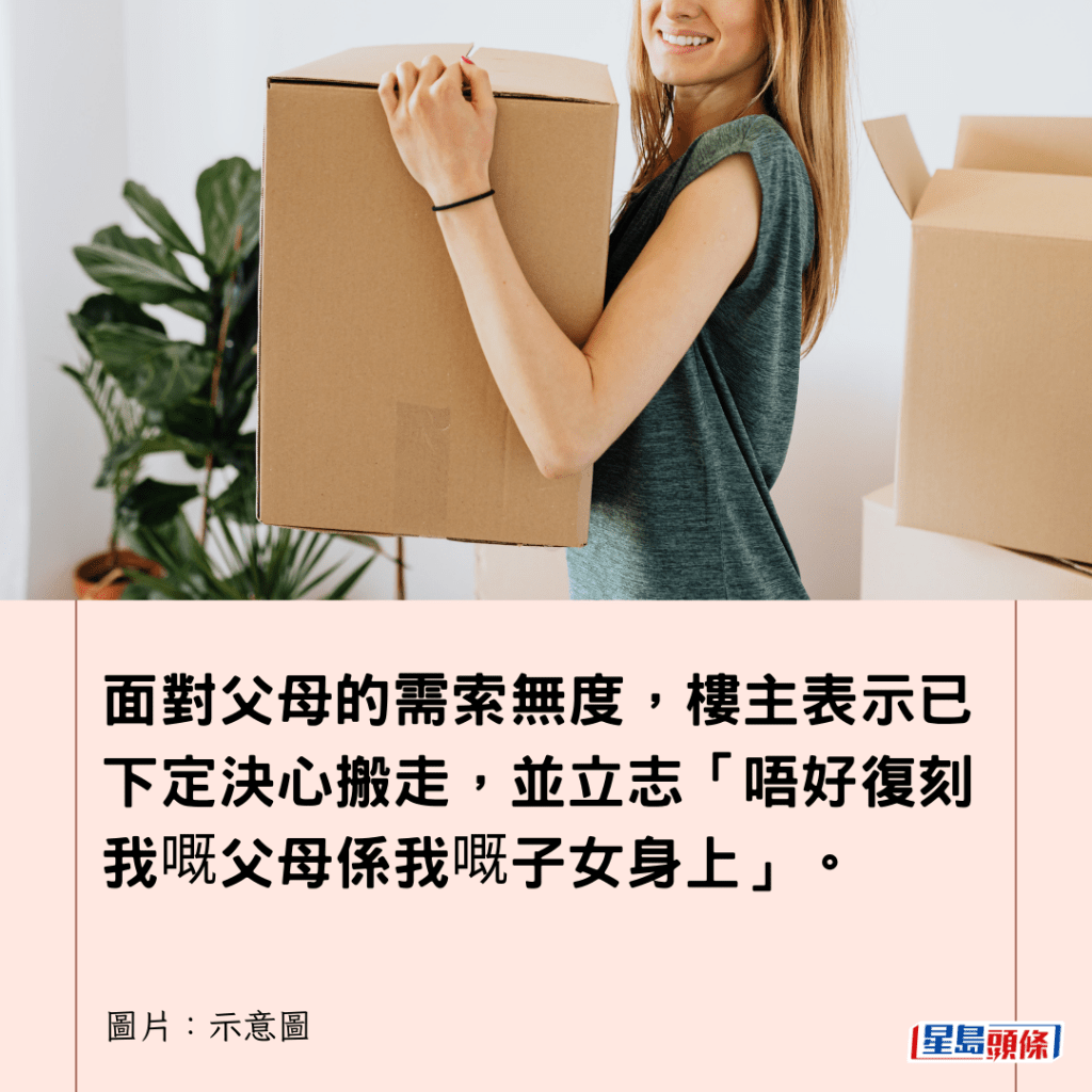 面对父母的需索无度,楼主表示已下定决心搬走,并立志“唔好复刻我嘅父母系我嘅子女身上”。