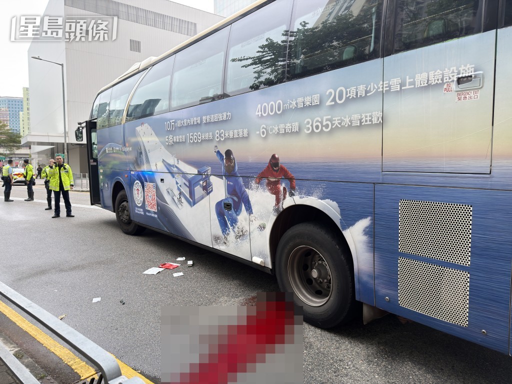 穿梭巴撞倒女途人,左邊後輪遺下大灘血迹。梁國峰攝