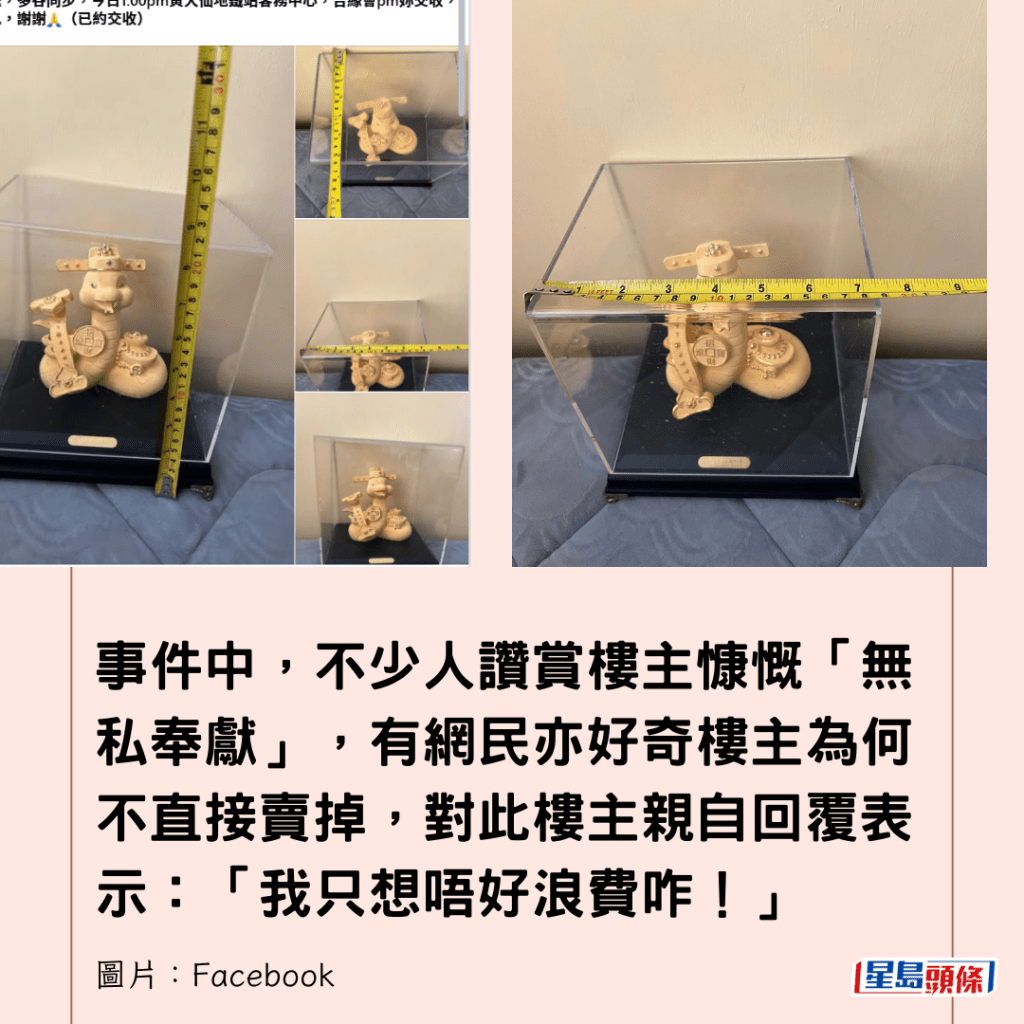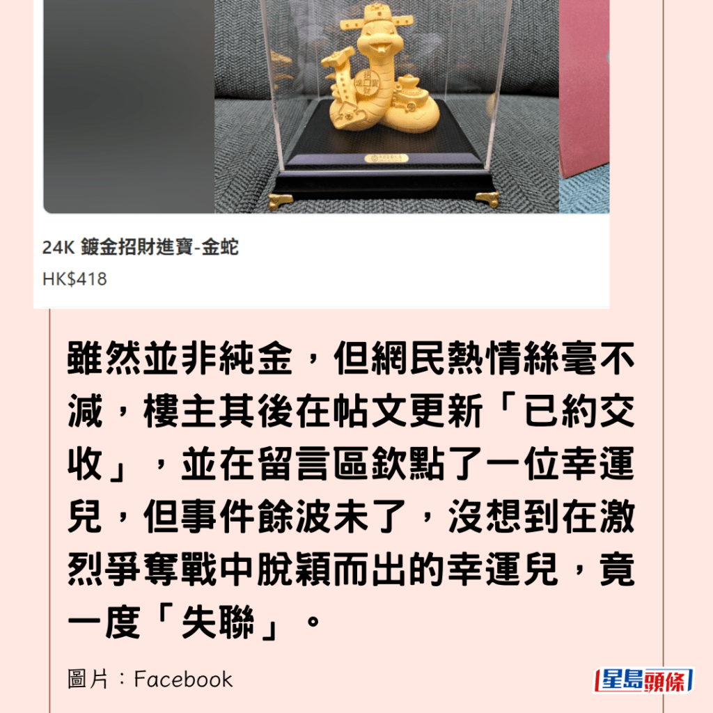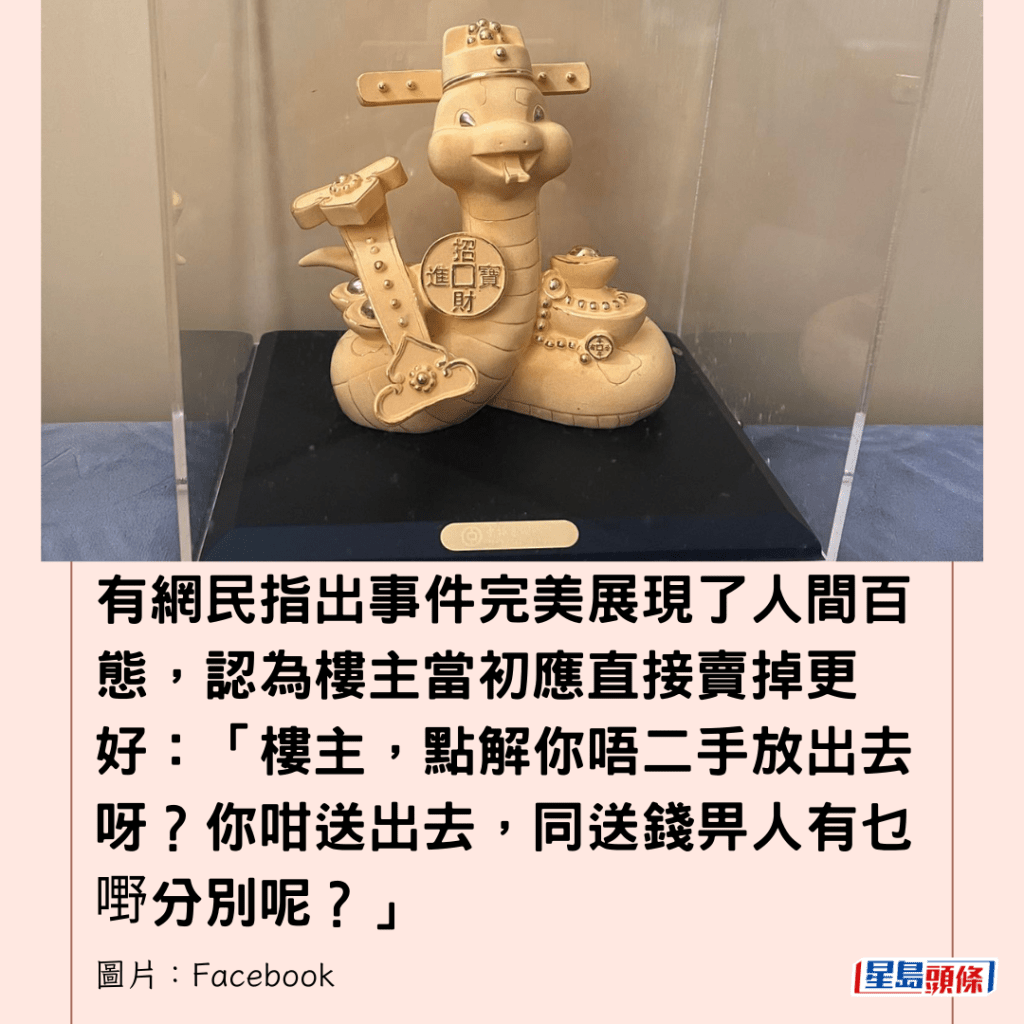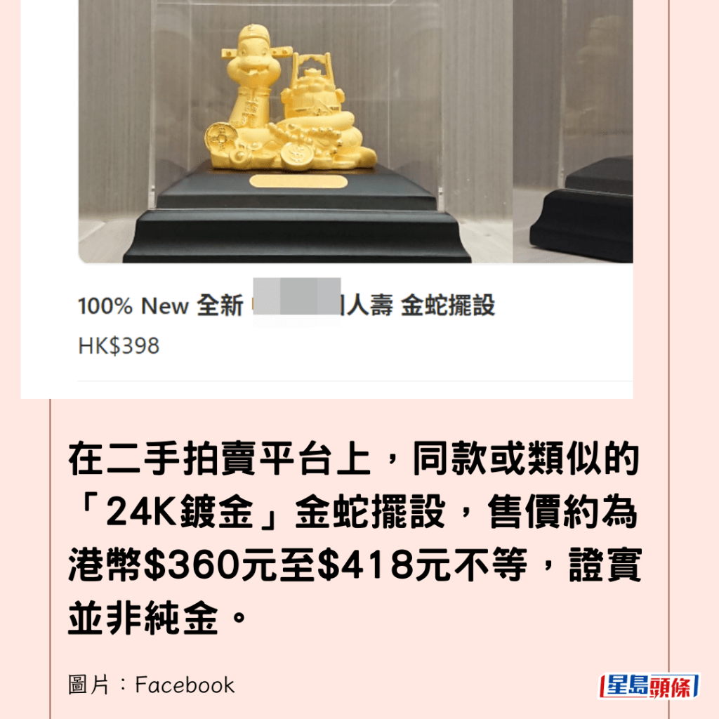 事實上,有眼利網民已迅速「起底」,發現這款金蛇擺設其實是某銀行集團人壽部門推出的紀念品,在二手拍賣平台上,同款或類似的「24K鍍金」金蛇擺設,售價約為港幣$360元至$418元不等,證實並非純金。