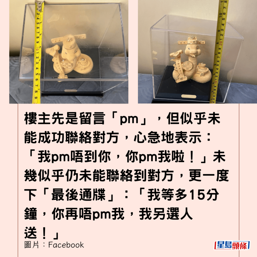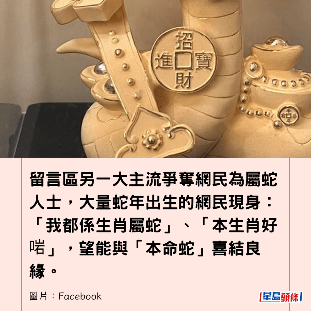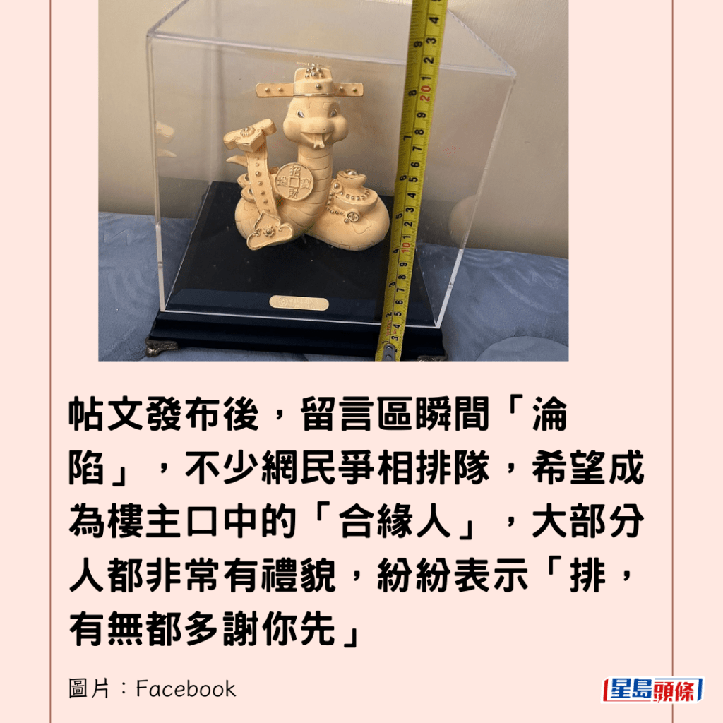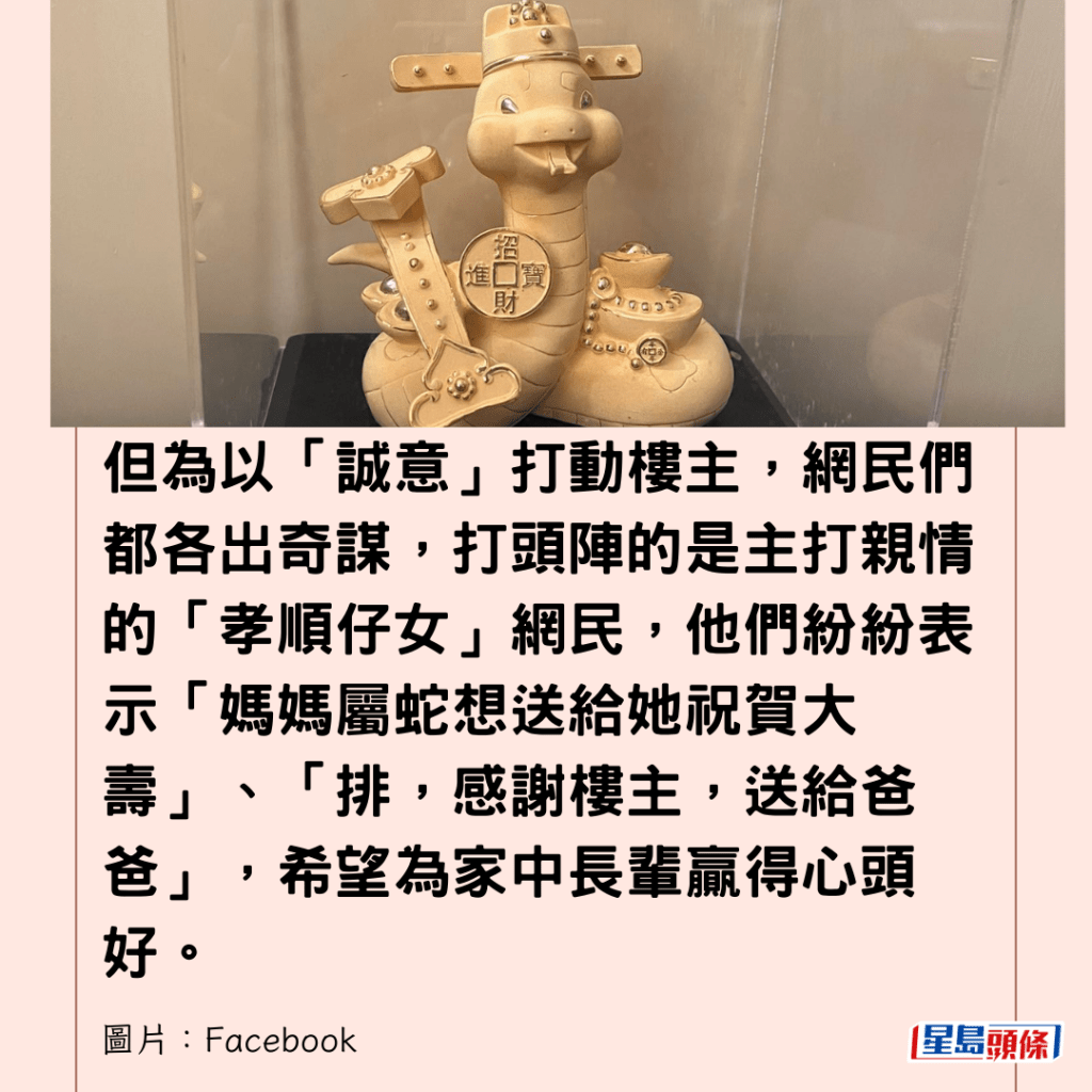有女網民在Facebook多個群組發帖,表示要「隨心送」一個金蛇擺設,帖文一出即引來網民哄動瘋搶,留言區變成大型「許願池」,各出奇謀只為博取樓主青睞,有網民形容,當中的人性百態比金蛇更加耀目。