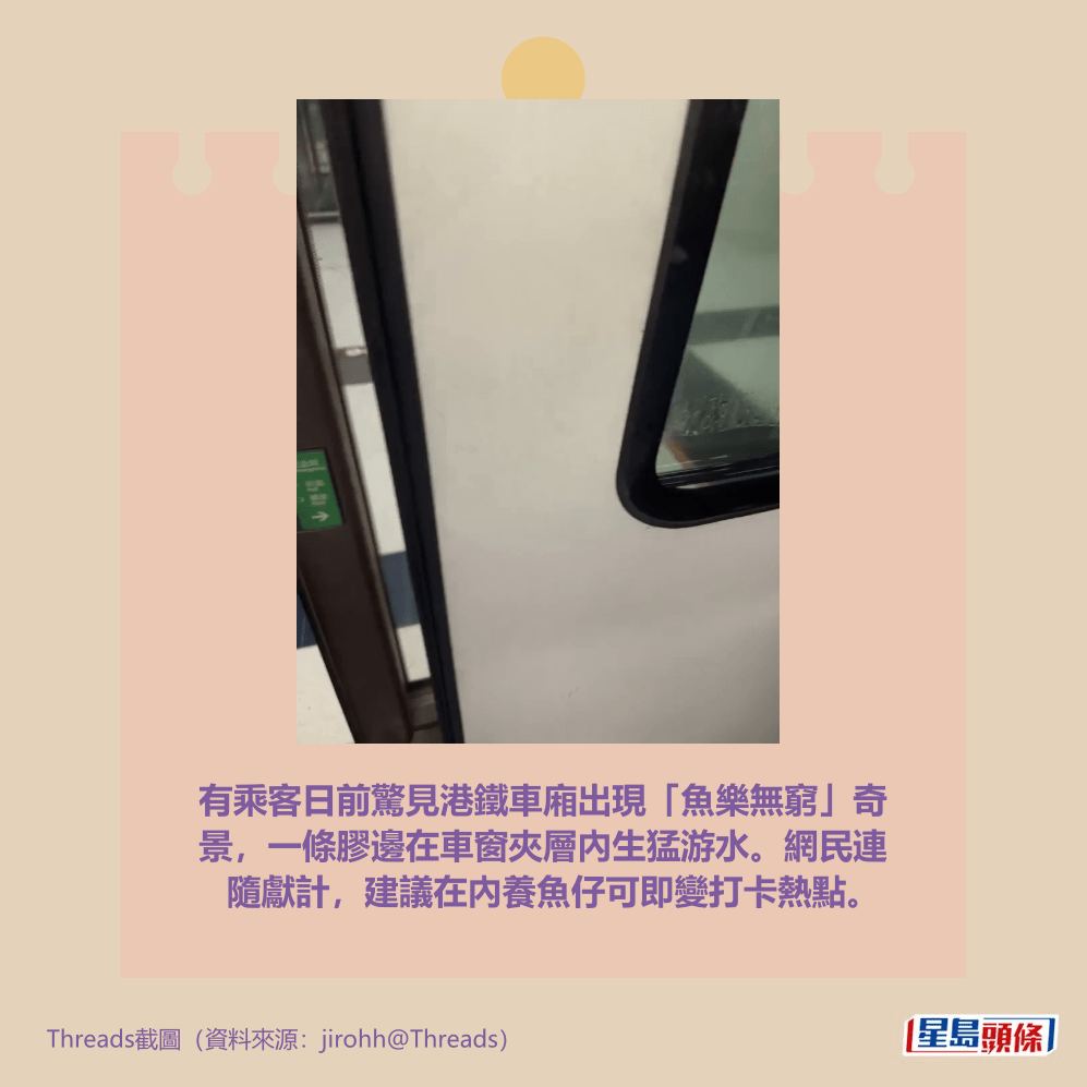 有乘客日前驚見港鐵車廂出現「魚樂無窮」奇景,一條膠邊在車窗夾層內生猛游水。網民連隨獻計,建議在內養魚仔可即變打卡熱點。詳情見下圖及下文:
