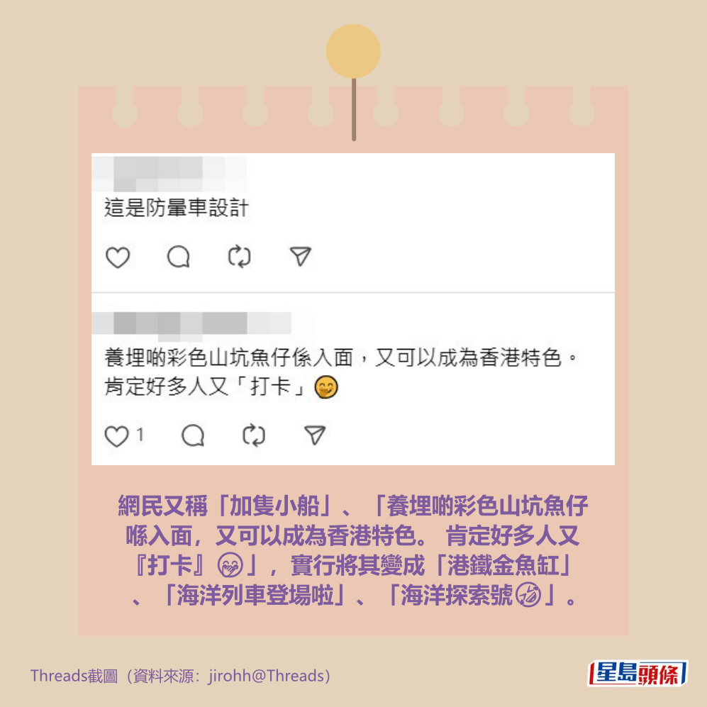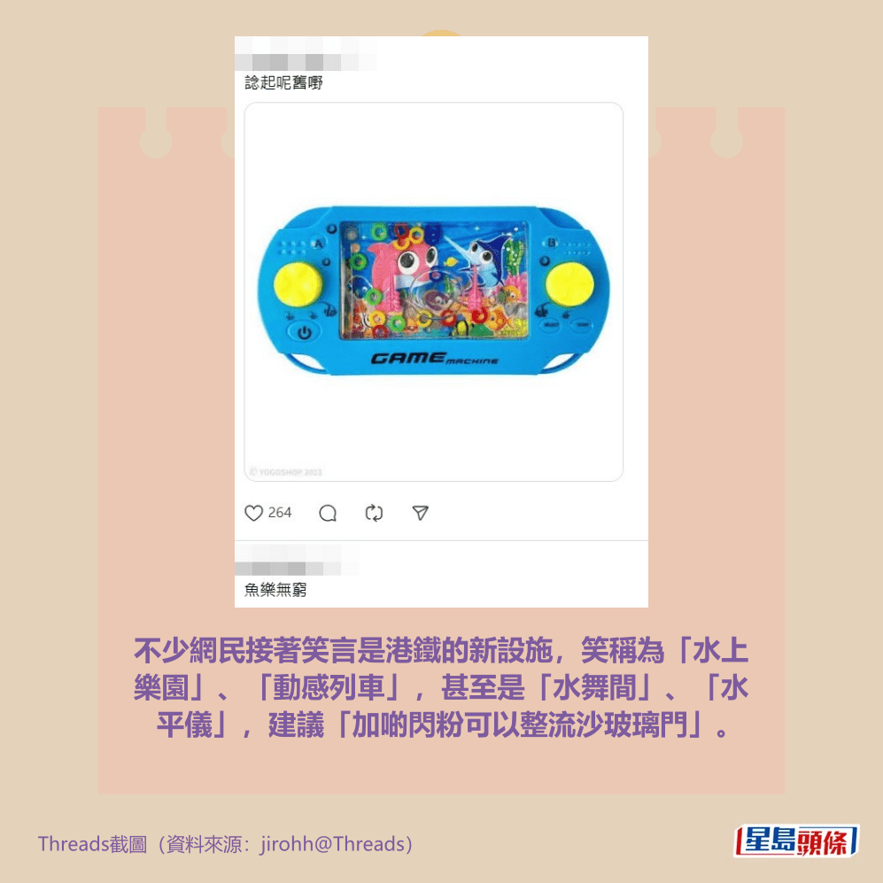 不少網民接著笑言是港鐵的新設施,笑稱為「水上樂園」、「動感列車」,甚至是「水舞間」、「水平儀」,建議「加啲閃粉可以整流沙玻璃門」。