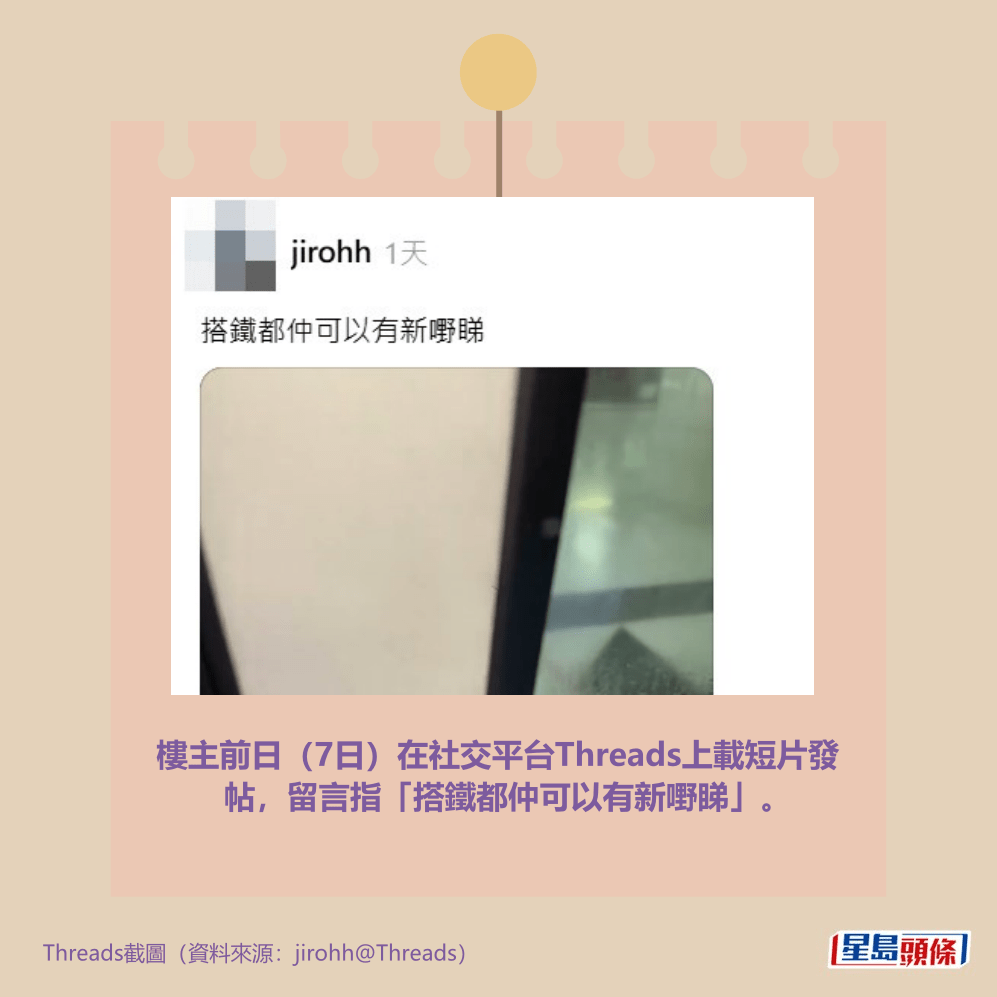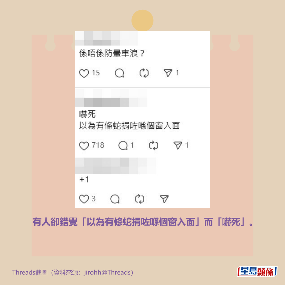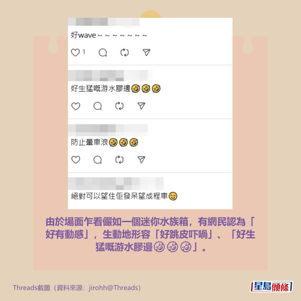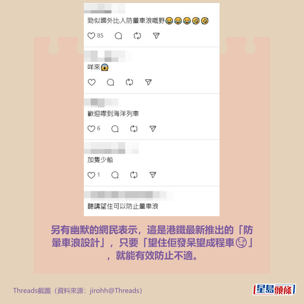 另有幽默的網民表示,這是港鐵最新推出的「防暈車浪設計」,只要「望住佢發呆望成程車🤤」,就能有效防止不適。有人卻錯覺「以為有條蛇捐咗喺個窗入面」而「嚇死」。