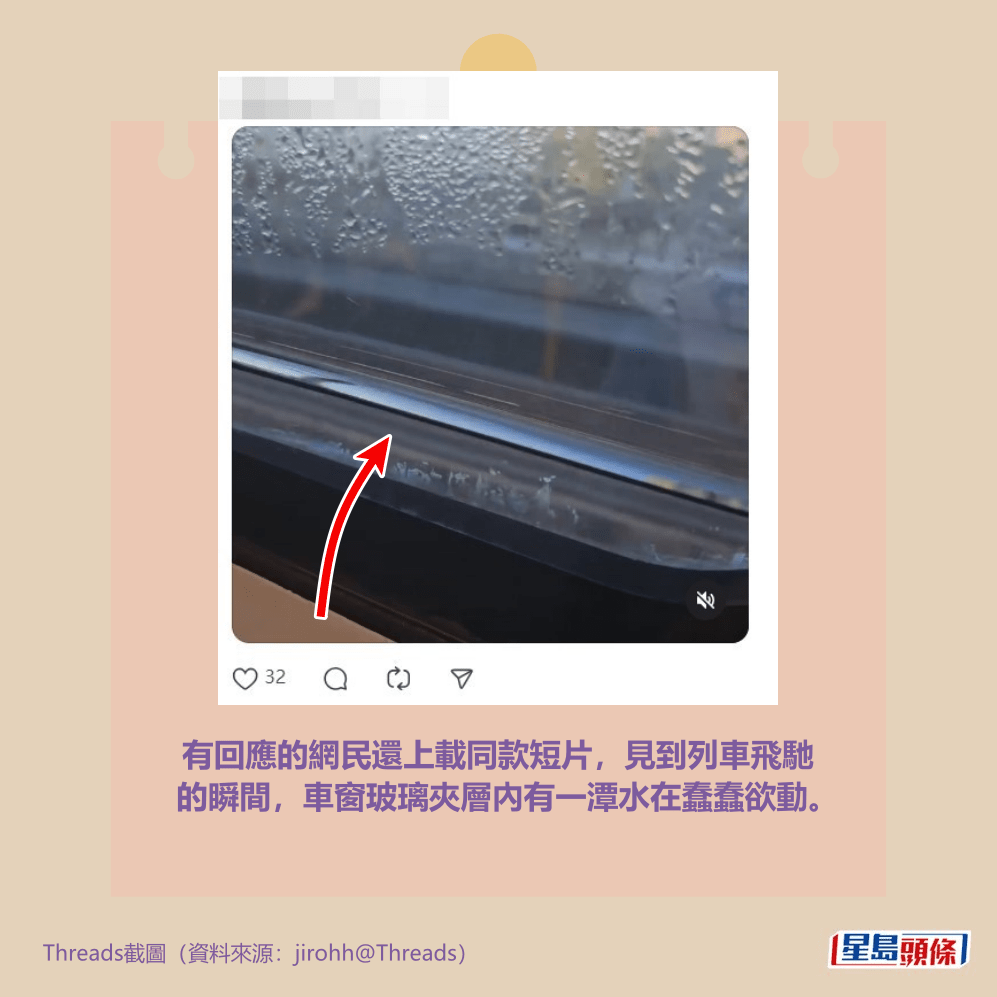 有回應的網民還上載同款短片,見到列車飛馳的瞬間,車窗玻璃夾層內有一潭水在蠢蠢欲動。