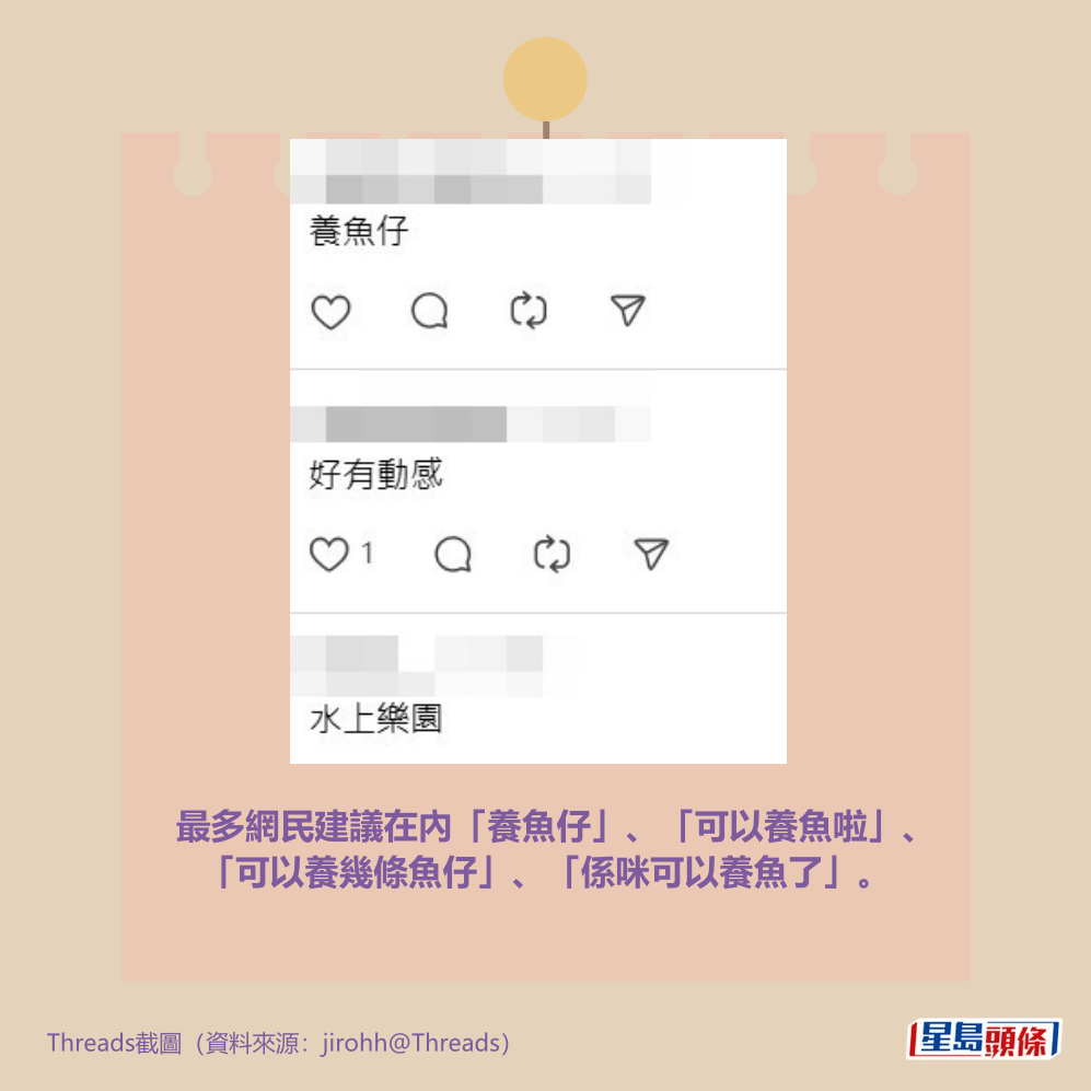 最多網民建議在內「養魚仔」、「可以養魚啦」、「可以養幾條魚仔」、「係咪可以養魚了」;又稱「加隻小船」、「養埋啲彩色山坑魚仔喺入面,又可以成為香港特色。 肯定好多人又『打卡』🤭」,實行將其變成「港鐵金魚缸」、「海洋列車登場啦」、「海洋探索號🤣」。
