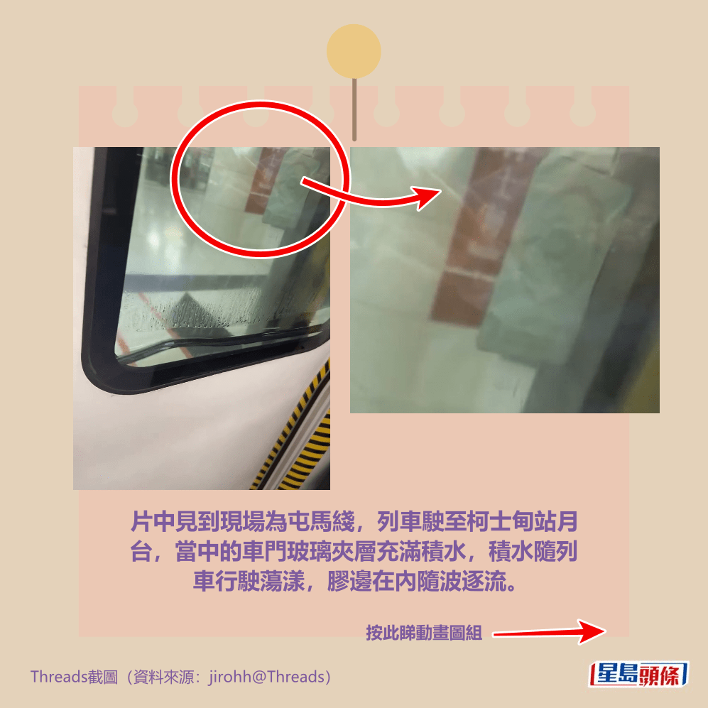 樓主前日(7日)在社交平台Threads上載短片發帖,留言指「搭鐵都仲可以有新嘢睇」。片中見到現場為屯馬綫,列車駛至柯士甸站月台,當中的車門玻璃夾層充滿積水,積水隨列車行駛蕩漾,膠邊在內隨波逐流。