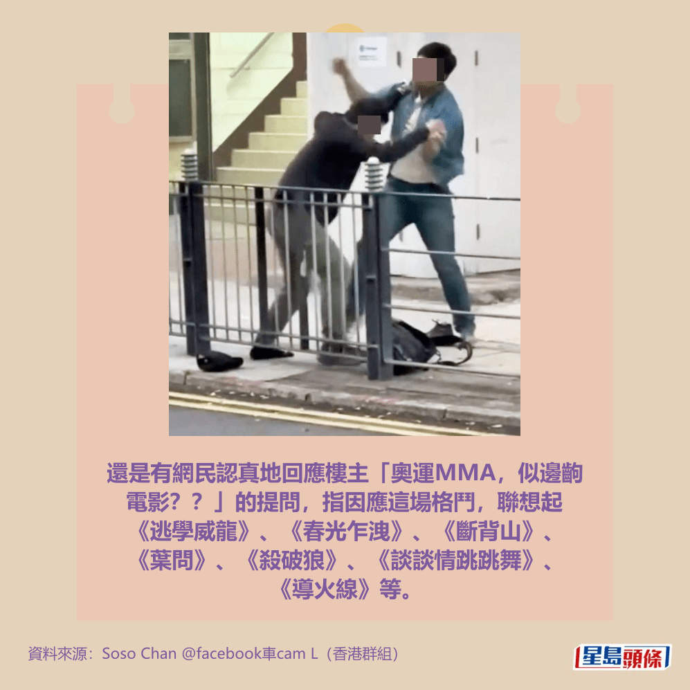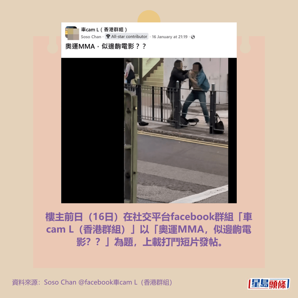 樓主前日(16日)在社交平台facebook群組「車cam L(香港群組)」以「奧運MMA,似邊齣電影??」為題,上載打鬥短片發帖。