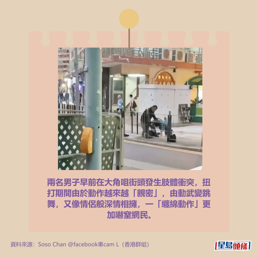 兩名男子早前在大角咀街頭發生肢體衝突,扭打期間由於動作越來越「親密」,由動武變跳舞,又像情侶般深情相擁,一「纏綿動作」更加嚇窒網民。詳情見下圖及下文: