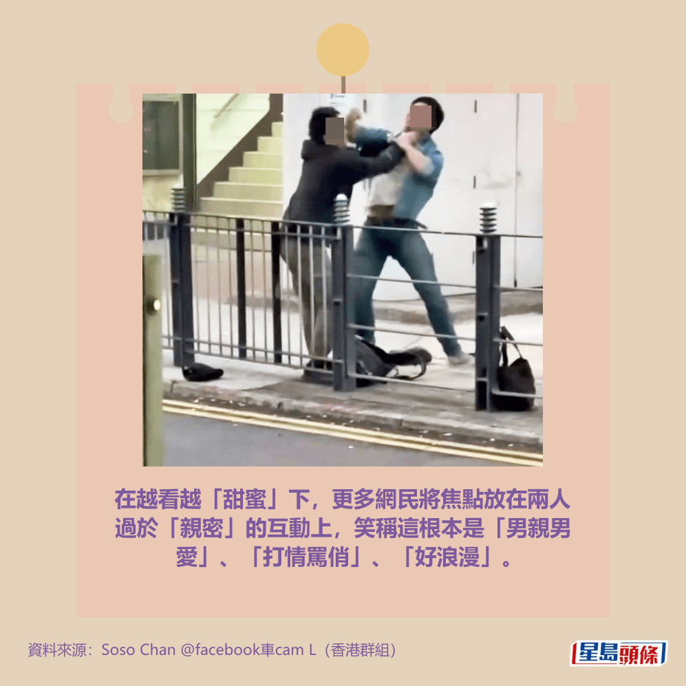 在越看越「甜蜜」下,更多網民將焦點放在兩人過於「親密」的互動上,笑稱這根本是「男親男愛」、「打情罵俏」、「好浪漫」。不過,也有「唔夠喉」的網民批評影片「無頭無尾」,並無交代事件的來龍去脈。
