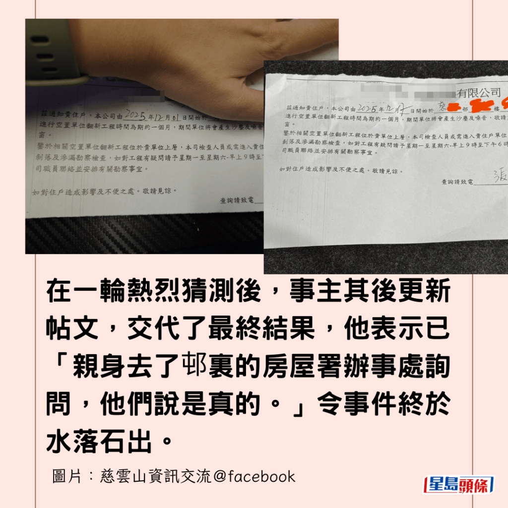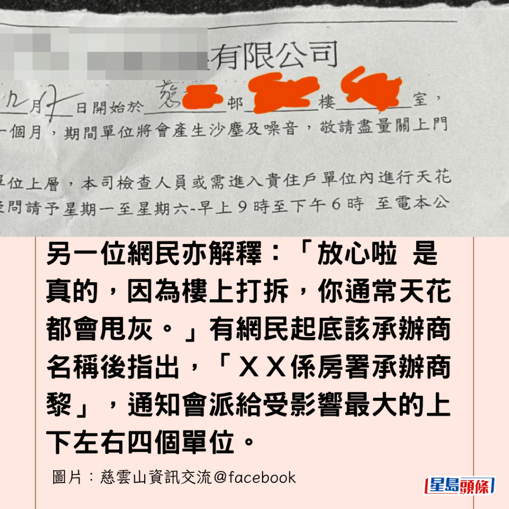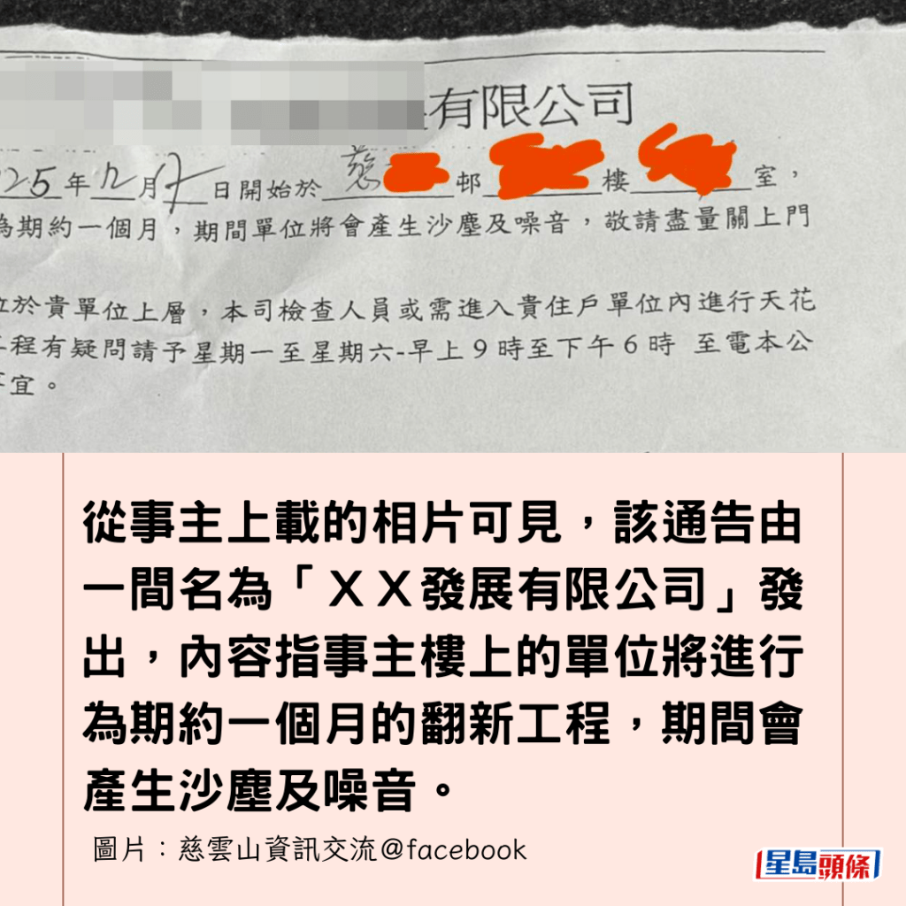 從事主上載的相片可見,該通告由一間名為「XX發展有限公司」發出,內容指事主樓上的單位將進行為期約一個月的翻新工程,期間會產生沙塵及噪音。