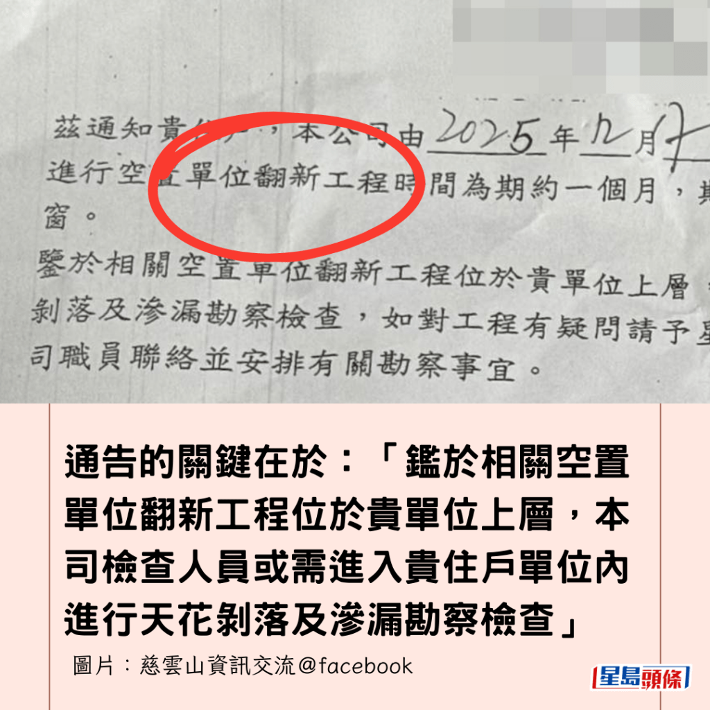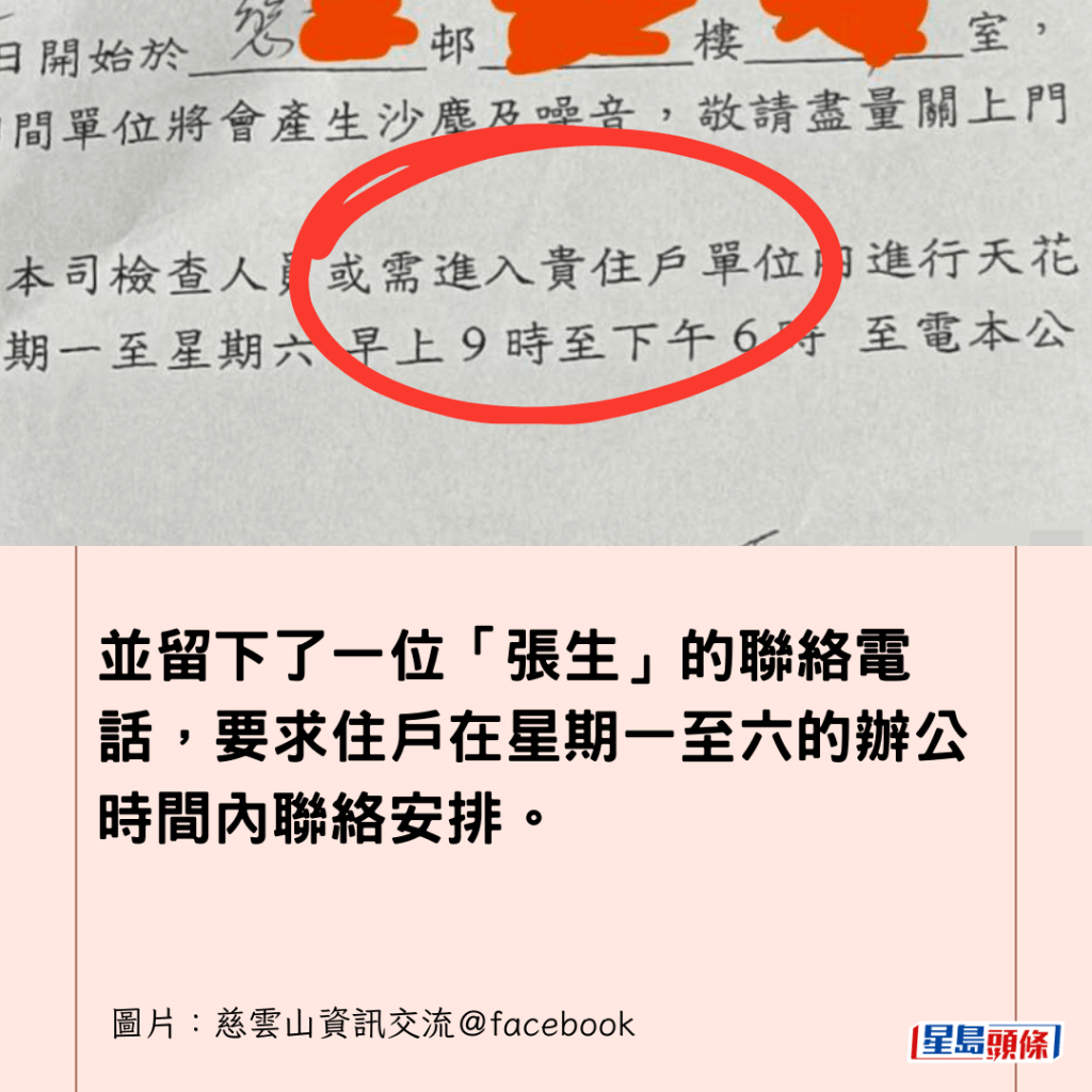 通告的關鍵在於:「鑑於相關空置單位翻新工程位於貴單位上層,本司檢查人員或需進入貴住戶單位內進行天花剝落及滲漏勘察檢查」,並留下了一位「張生」的聯絡電話,要求住戶在星期一至六的辦公時間內聯絡安排。