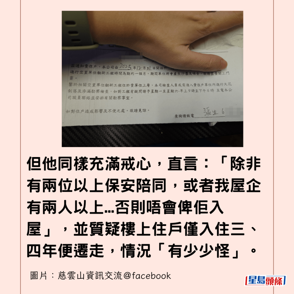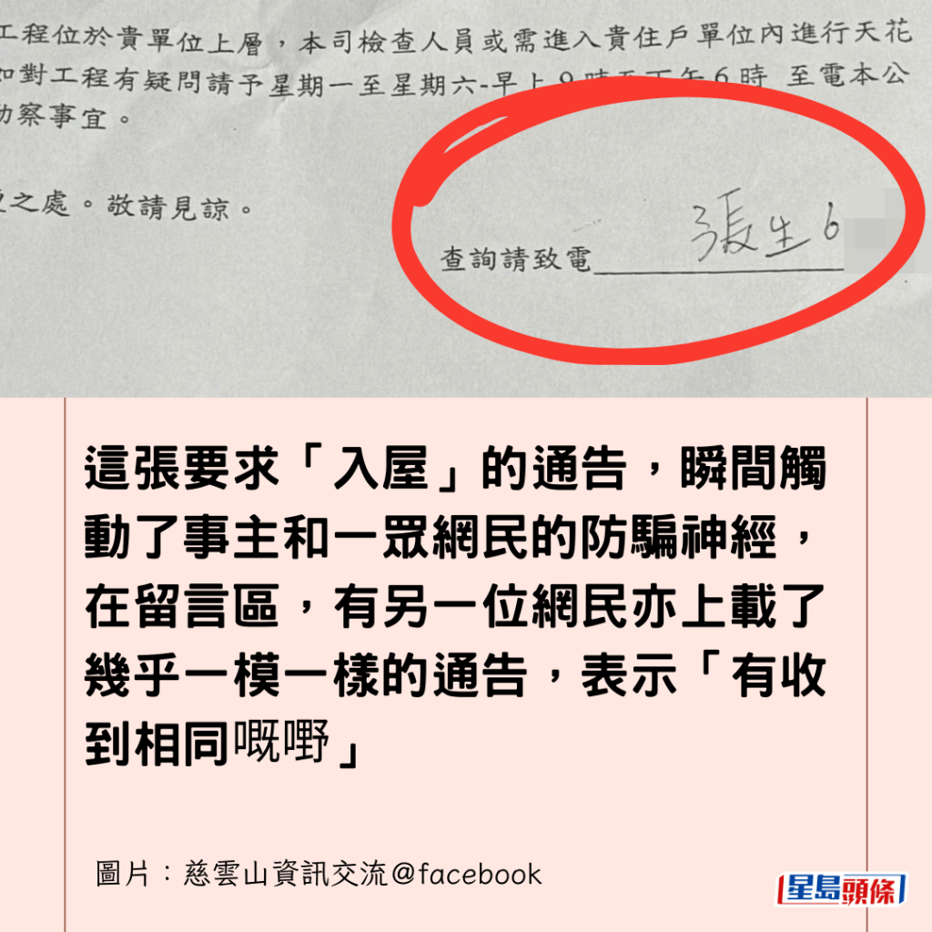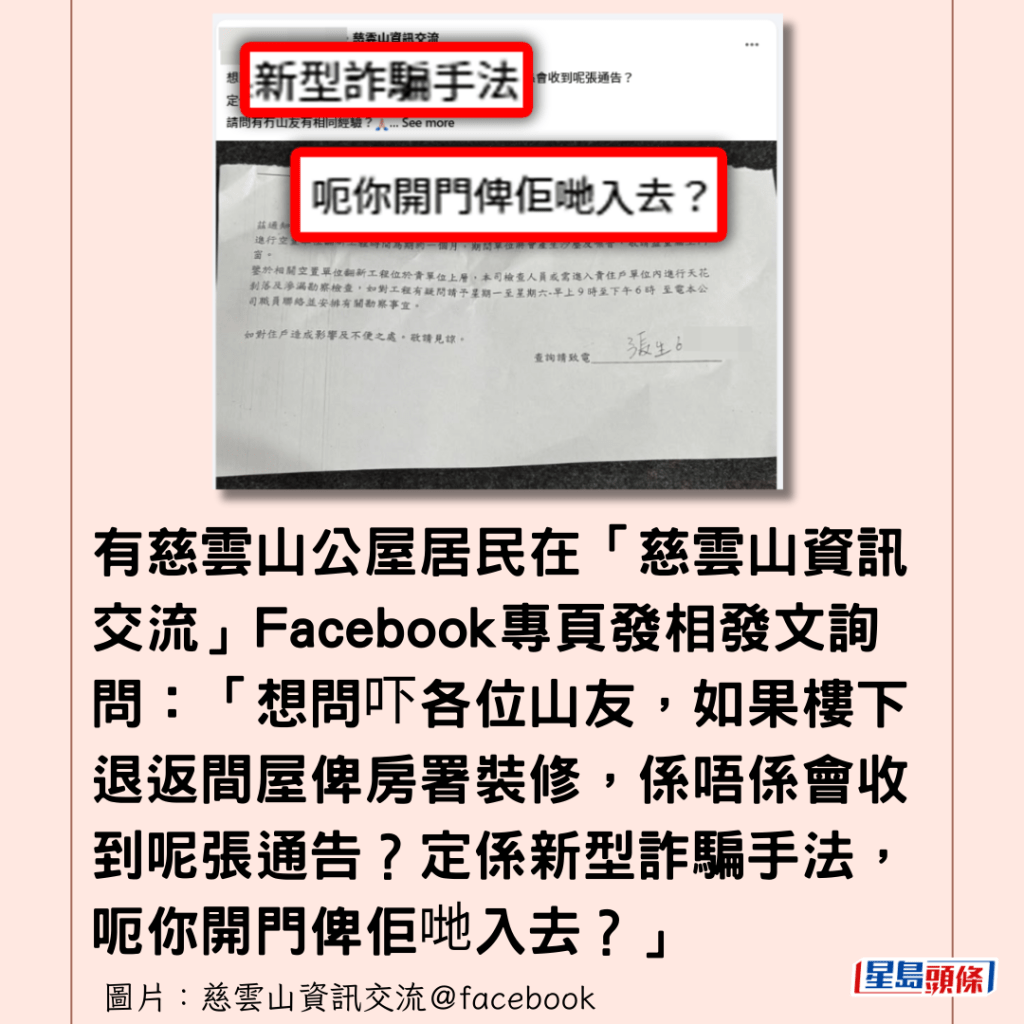 詐騙手法層出不窮,市民防騙意識大大提高,有慈雲山公屋居民在「慈雲山資訊交流」Facebook專頁發相發文詢問:「想問吓各位山友,如果樓下退返間屋俾房署裝修,係唔係會收到呢張通告?定係新型詐騙手法,呃你開門俾佢哋入去?」