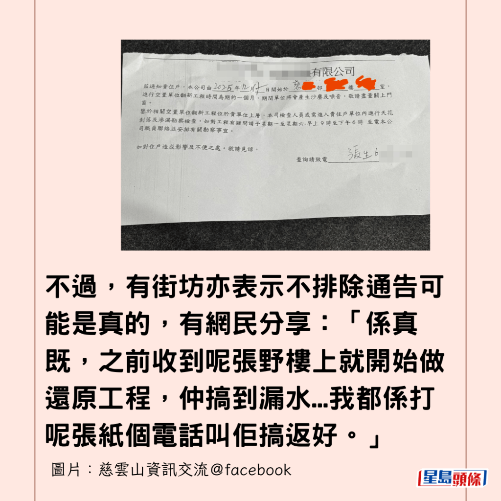 不過,有街坊亦表示不排除通告可能是真的,有網民分享:「係真既,之前收到呢張野樓上就開始做還原工程,仲搞到漏水...我都係打呢張紙個電話叫佢搞返好。」另一位網民亦解釋:「放心啦 是真的,因為樓上打拆,你通常天花都會甩灰。」有網民起底該承辦商名稱後指出,「XX係房署承辦商黎」,通知會派給受影響最大的上下左右四個單位。