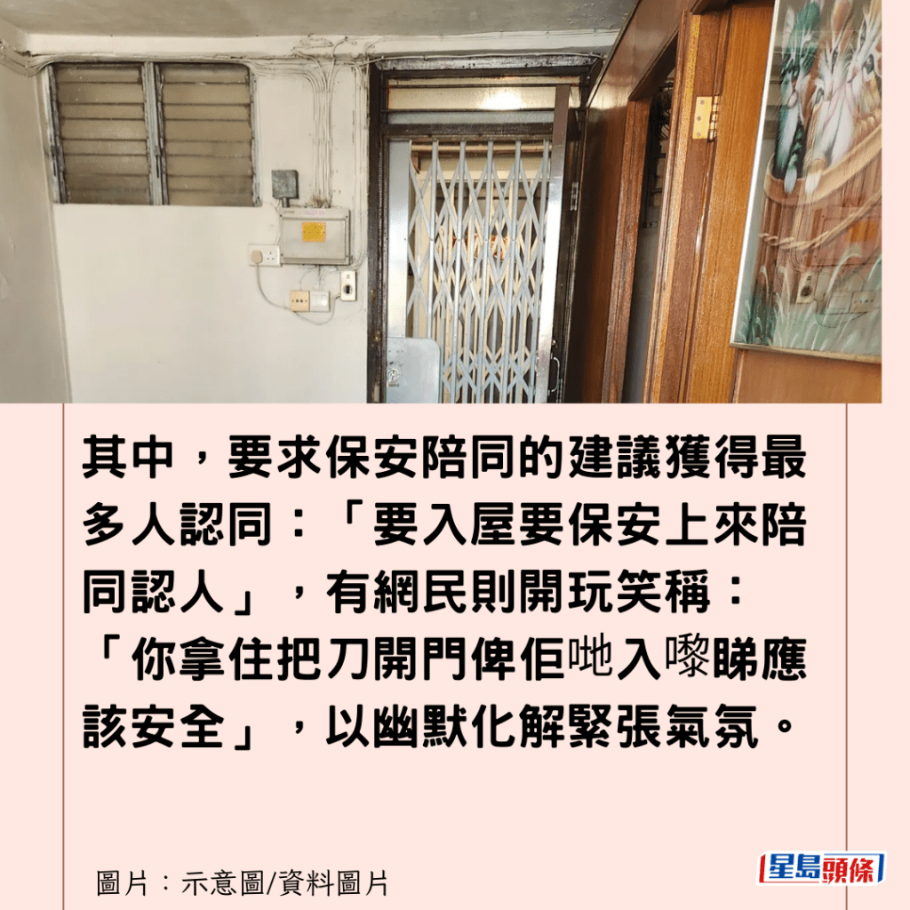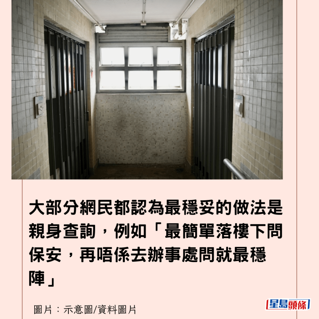 大部分網民都認為最穩妥的做法是親身查詢,例如「最簡單落樓下問保安,再唔係去辦事處問就最穩陣」,其中,要求保安陪同的建議獲得最多人認同:「要入屋要保安上來陪同認人」,有網民則開玩笑稱:「你拿住把刀開門俾佢哋入嚟睇應該安全」,以幽默化解緊張氣氛。