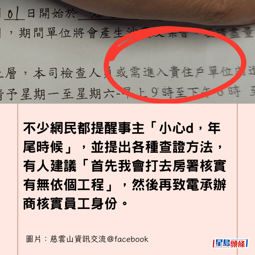 不少網民都提醒事主「小心d,年尾時候」,並提出各種查證方法,有人建議「首先我會打去房署核實有無依個工程」,然後再致電承辦商核實員工身份。
