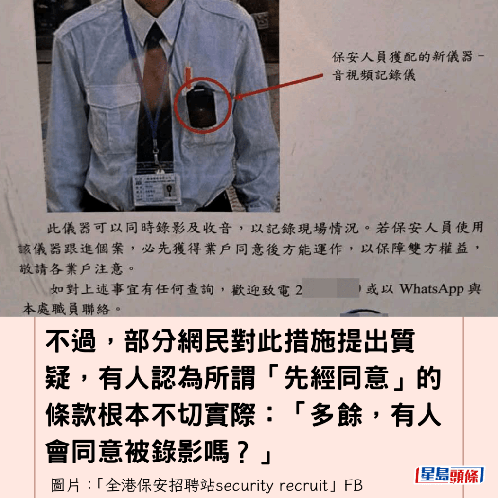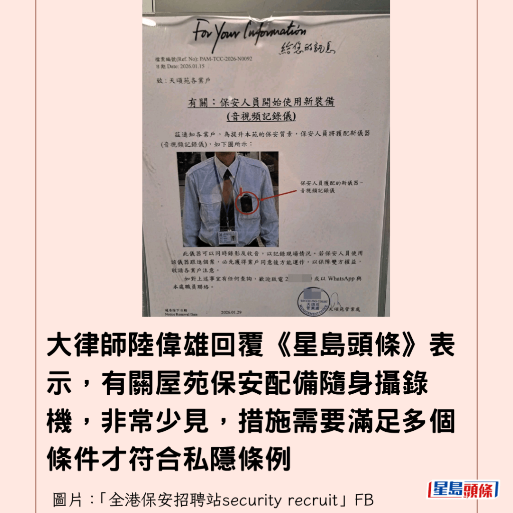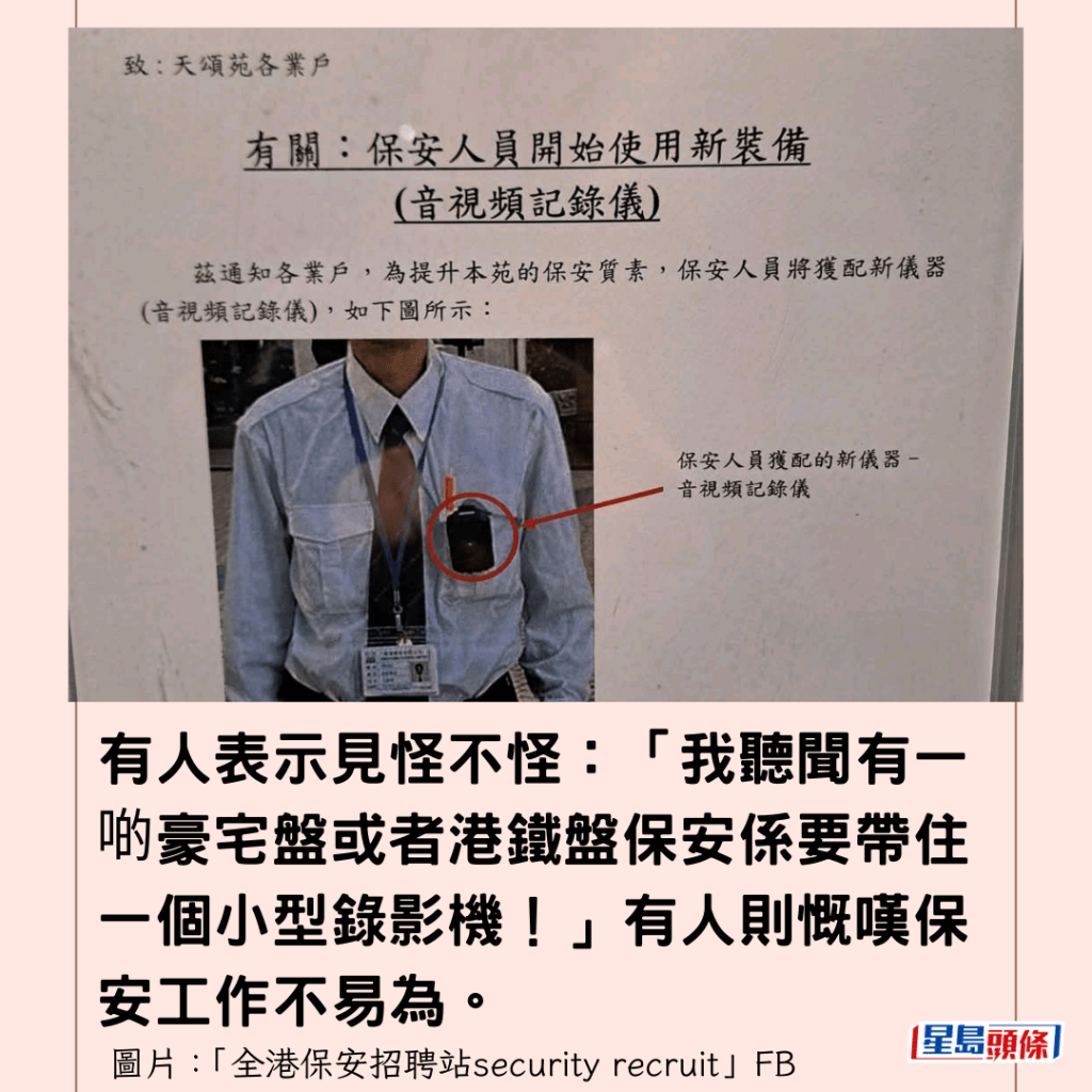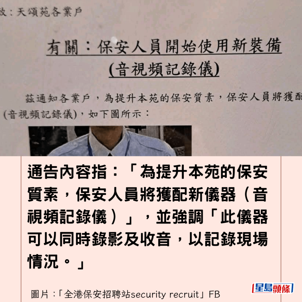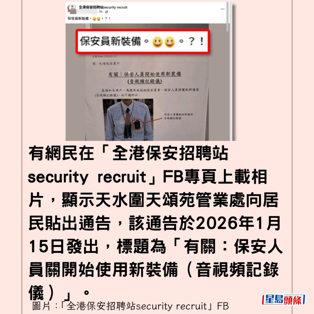 有網民今早(20日)在「全港保安招聘站security recruit」FB專頁上載相片,顯示天水圍天頌苑管業處向居民貼出通告,該通告於2026年1月15日發出,標題為「有關:保安人員關開始使用新裝備(音視頻記錄儀)」。通告內容指:「為提升本苑的保安質素,保安人員將獲配新儀器(音視頻記錄儀)」,並強調「此儀器可以同時錄影及收音,以記錄現場情況。」