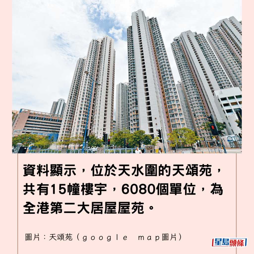 資料顯示,位於天水圍的天頌苑,共有15幢樓宇,6080個單位,為全港第二大居屋屋苑。