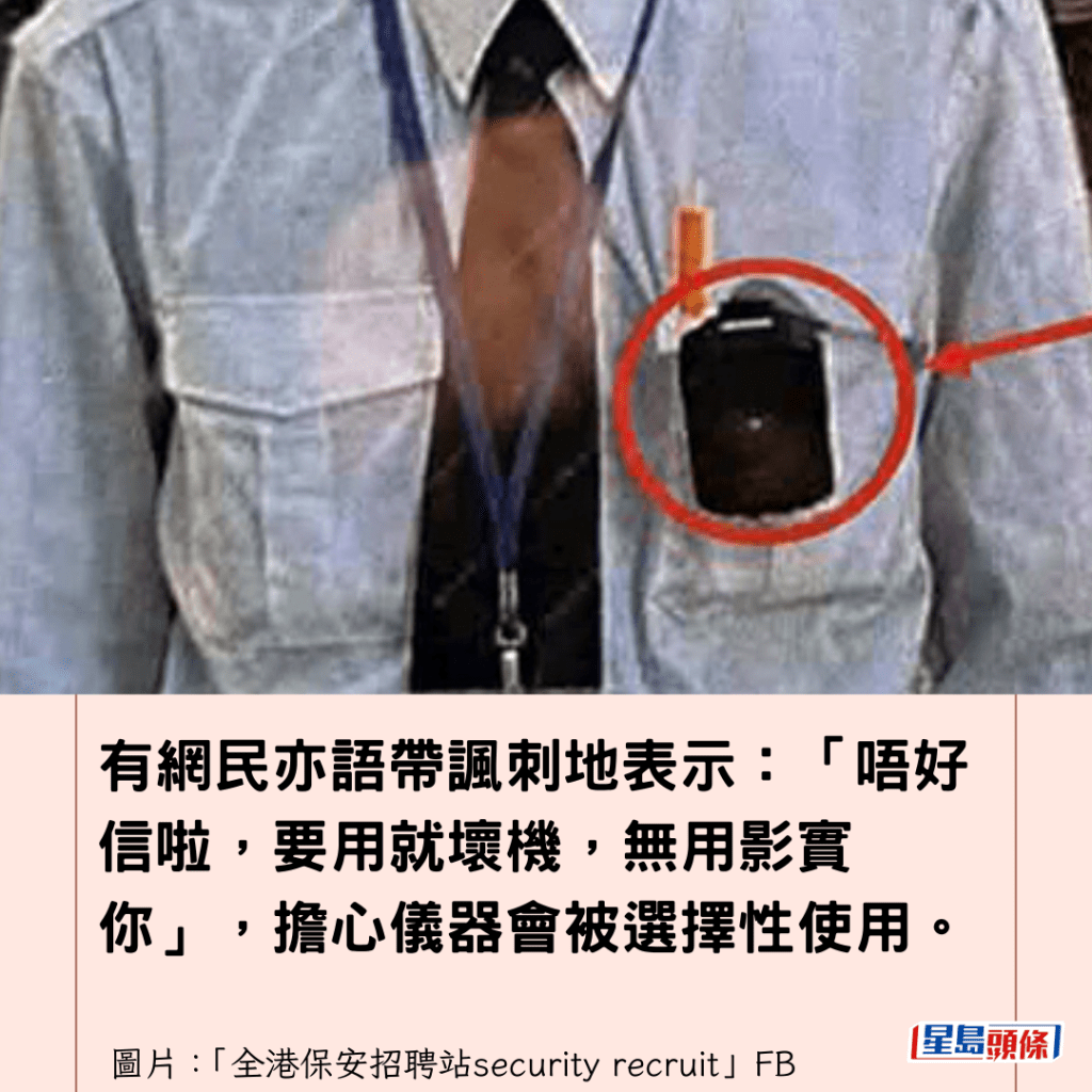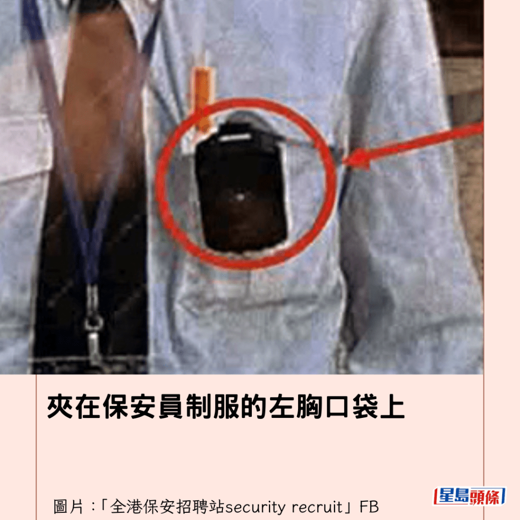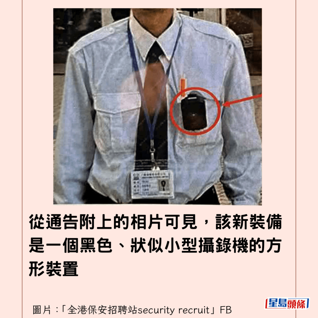 從通告附上的相片可見,該新裝備是一個黑色、狀似小型攝錄機的方形裝置,夾在保安員制服的左胸口袋上。