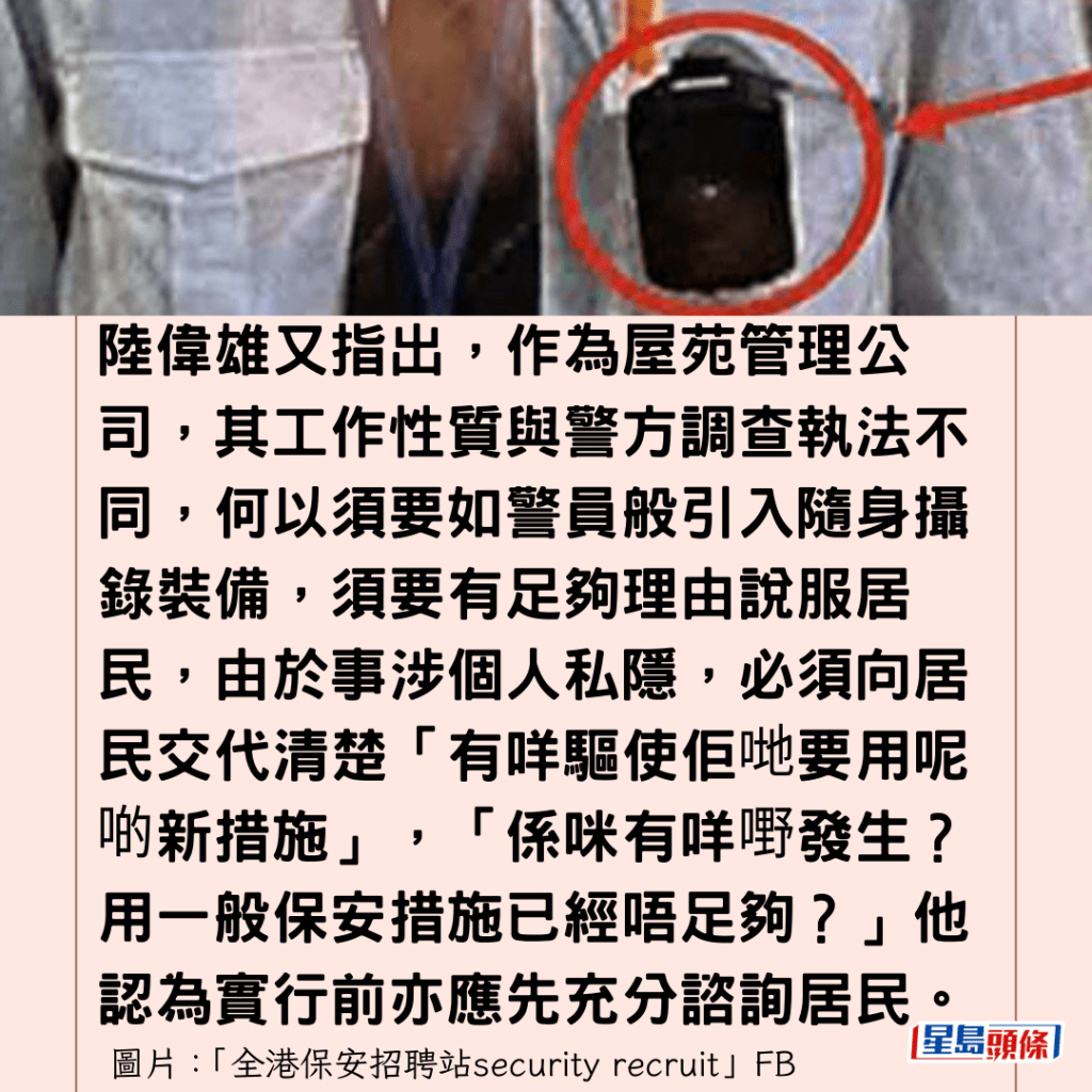 陸偉雄又指出,作為屋苑管理公司,其工作性質與警方調查執法不同,何以須要如警員般引入隨身攝錄裝備,須要有足夠理由說服居民,由於事涉個人私隱,必須向居民交代清楚「有咩驅使佢哋要用呢啲新措施」,「係咪有咩嘢發生?用一般保安措施已經唔足夠?」他認為實行前亦應先充分諮詢居民。
