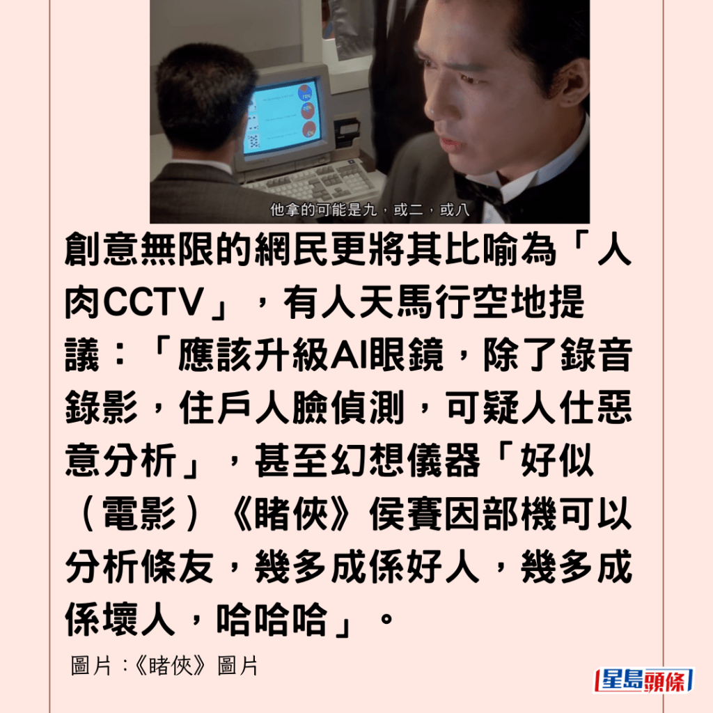 有網民實際地擔心這是否意味著「又加管理費啦」。新裝備的外型亦引發大量聯想,不少網民戲稱保安員「當自己是警察?」,甚至有人笑問是否「變咗美國警察?」。創意無限的網民更將其比喻為「人肉CCTV」,有人天馬行空地提議:「應該升級AI眼鏡,除了錄音錄影,住戶人臉偵測,可疑人仕惡意分析」,甚至幻想儀器「好似(電影)《睹俠》侯賽因部機可以分析條友,幾多成係好人,幾多成係壞人,哈哈哈」。