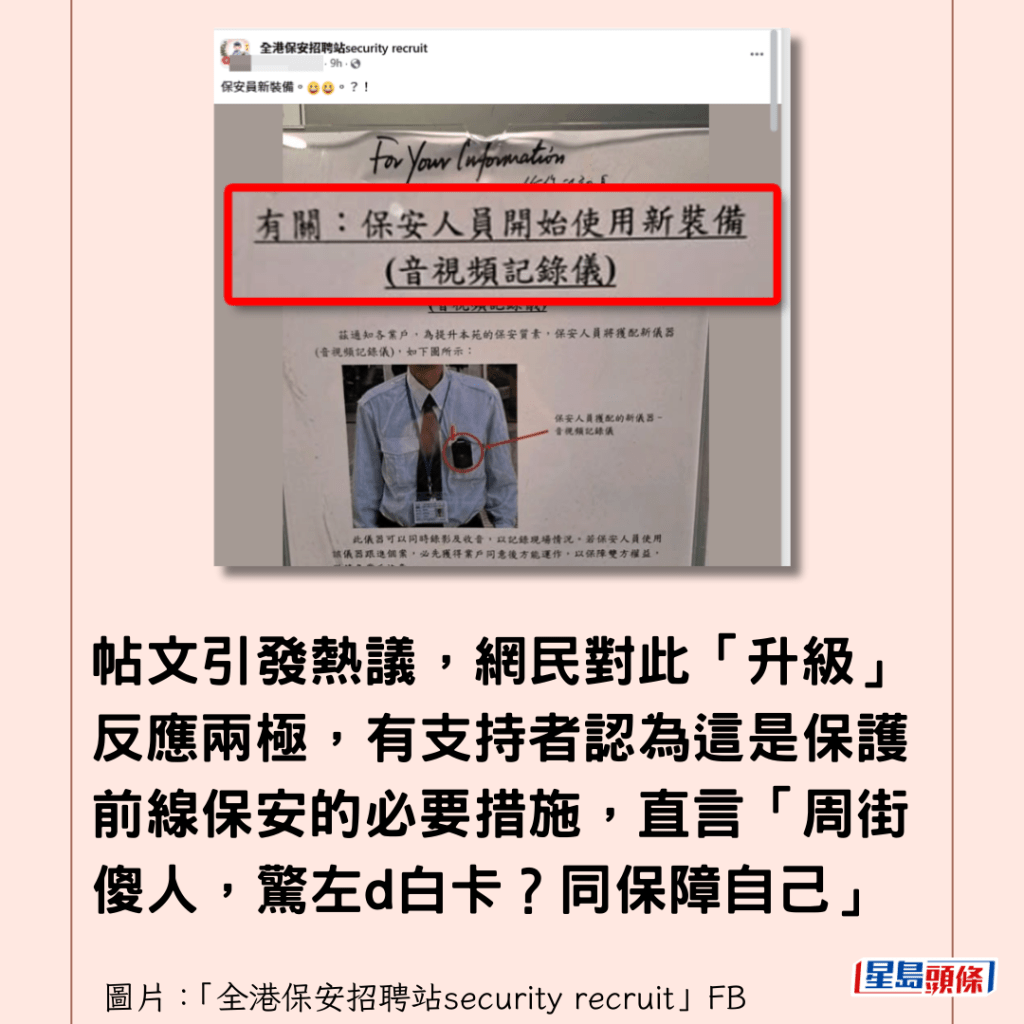帖文引發熱議,網民對此「升級」反應兩極,有支持者認為這是保護前線保安的必要措施,直言「周街傻人,驚左d白卡?同保障自己」,有人表示見怪不怪:「我聽聞有一啲豪宅盤或者港鐵盤保安係要帶住一個小型錄影機!」有人則慨嘆保安工作不易為。